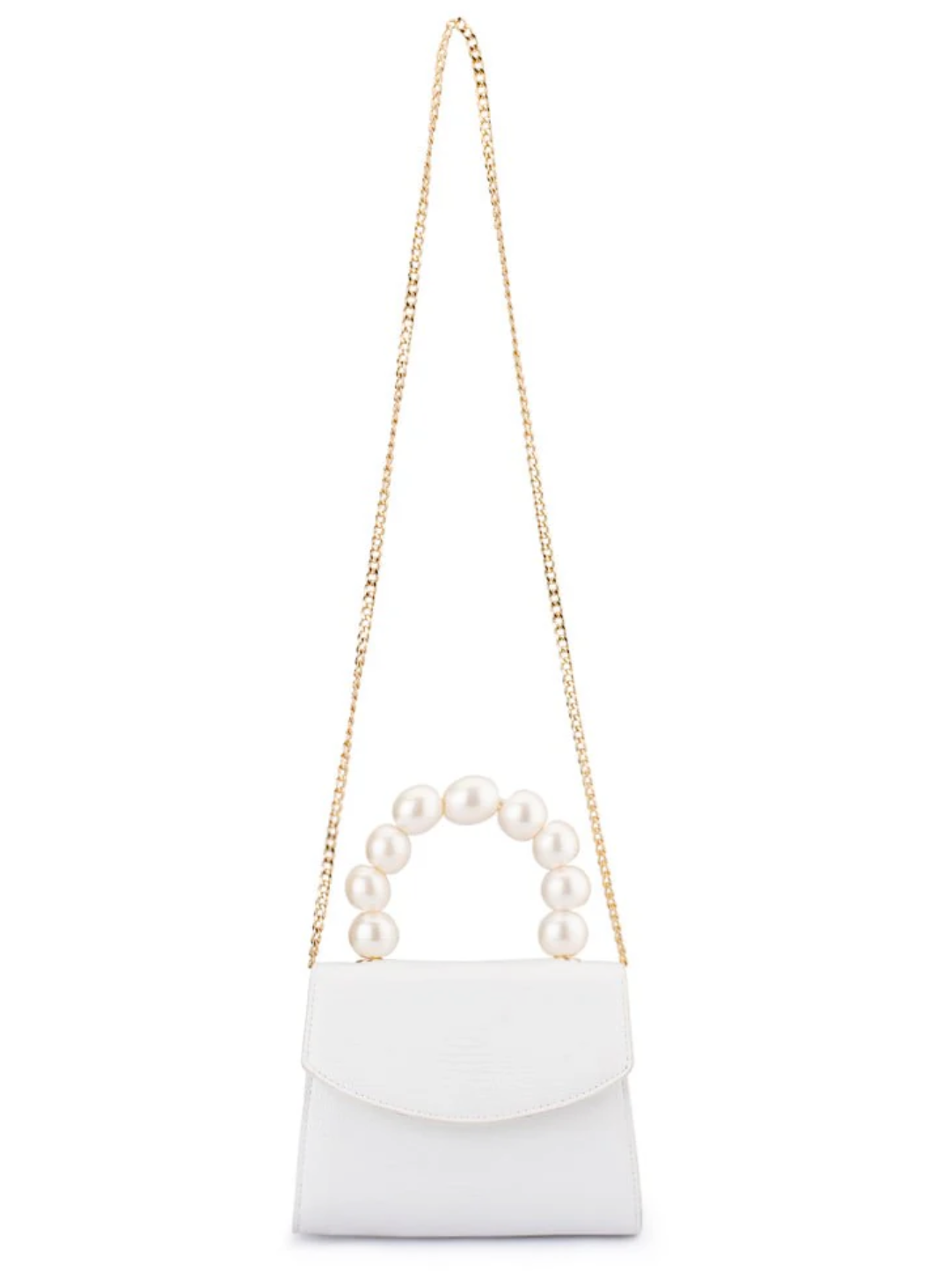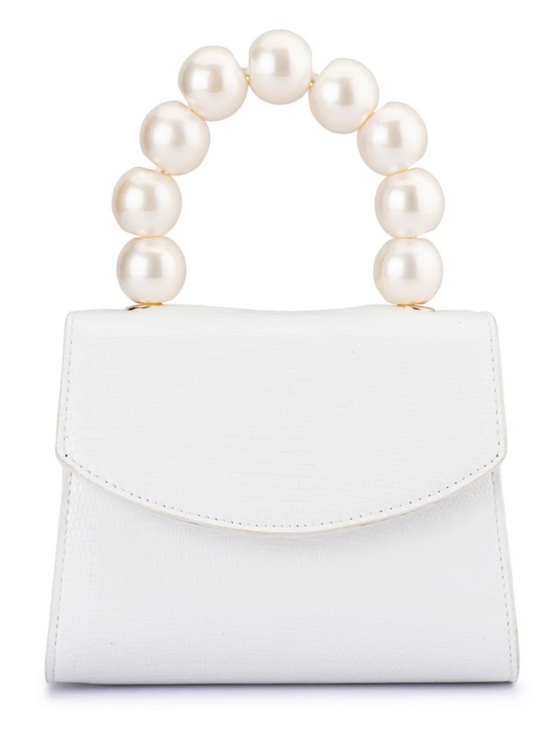 Elevate your day and night time looks with the super cute PETA pearl bead handle bag in White. It features a pearl bead top handle which contrasts beautifully with the structured body. It has plenty of room for a large smartphone, sunglasses and makeup essentials and includes a removable shoulder chain so you can switch to hands free at a moment's notice.