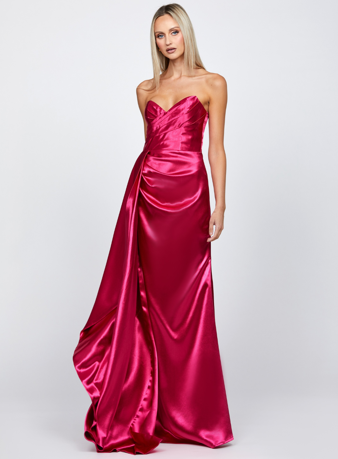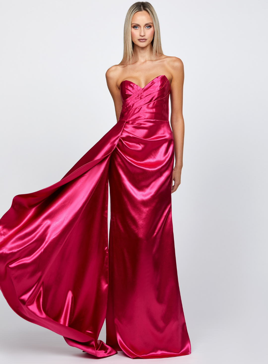 The Misha Gown is a stunning cocktail length dress by Bariano. Featuring an asymmetrical strapless neckline with full length skirt and side sash.