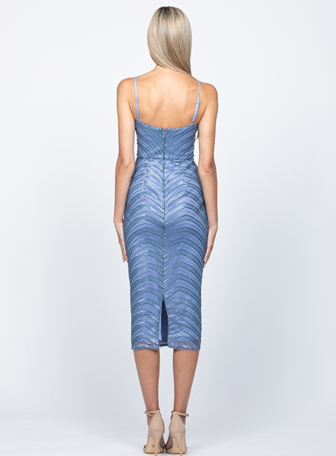 The Perla Midi is a stunning cocktail length dress by Bariano. Featuring a square neckline with sequin fabric and a tight midi skirt.