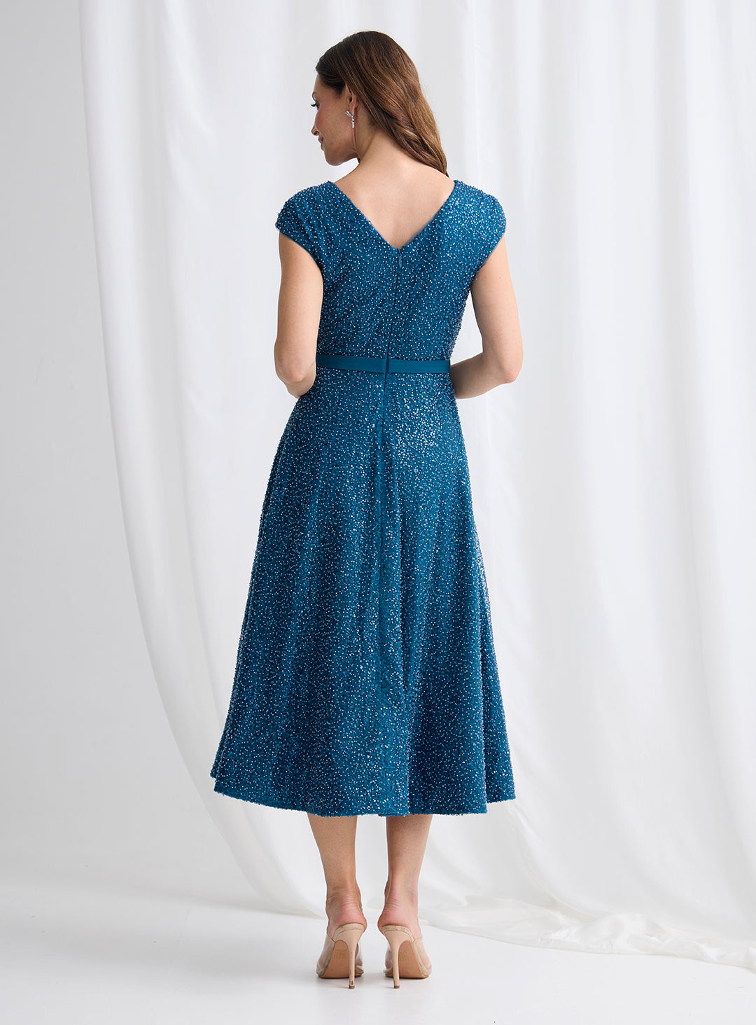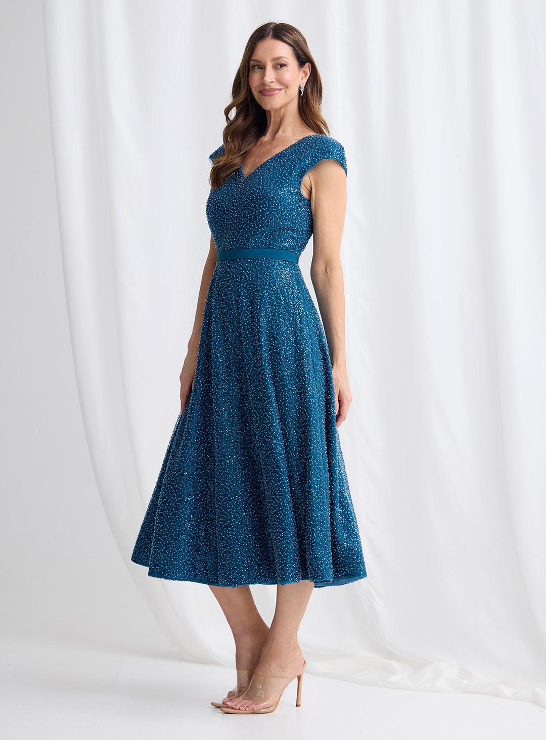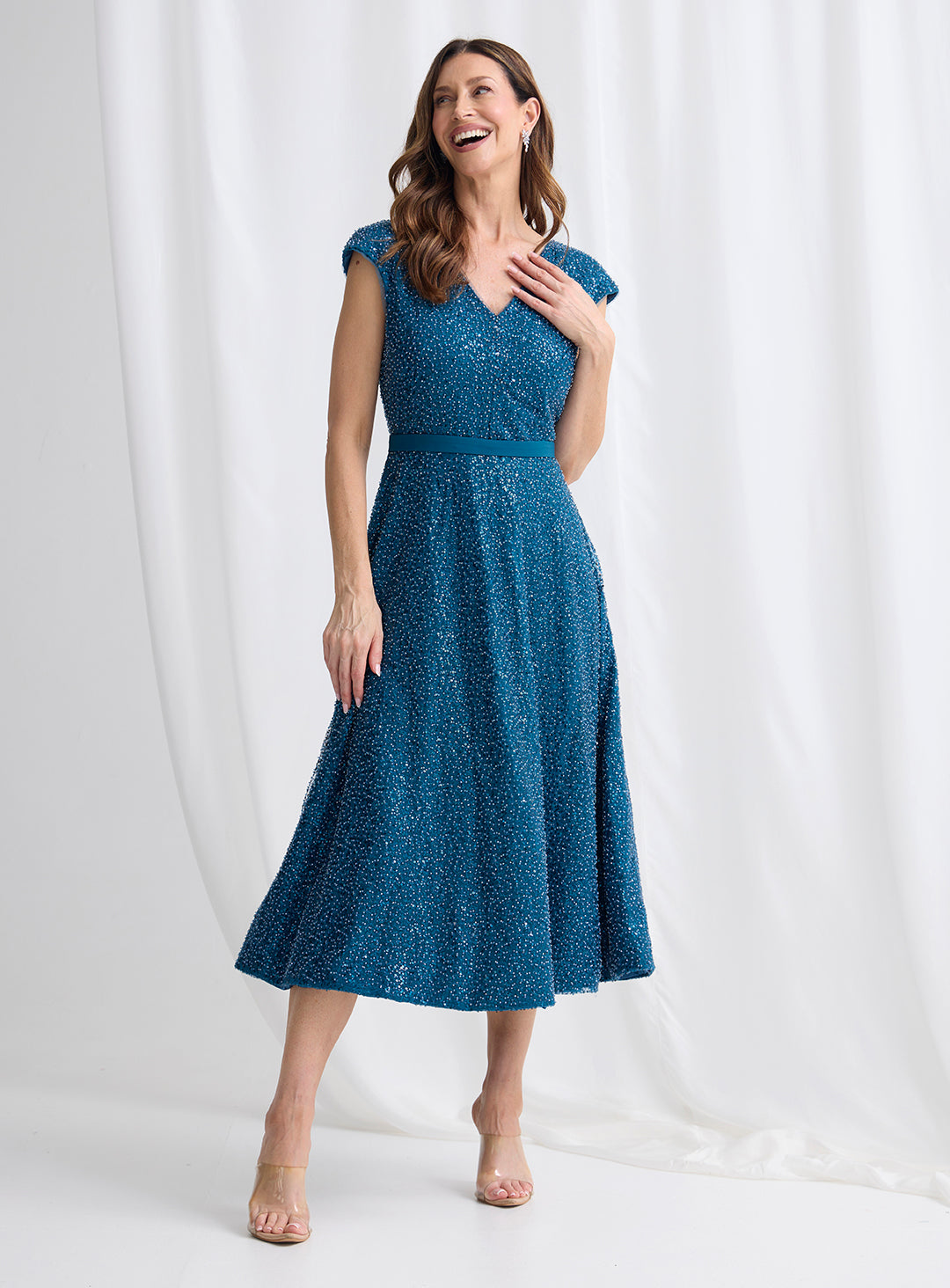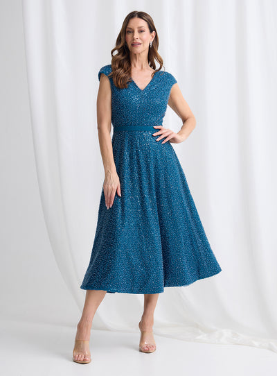 A gorgeous midi length dress by Trellis Lane. A flattering a-line style featuring a sequin overlay, deep v neckline and waistband.
