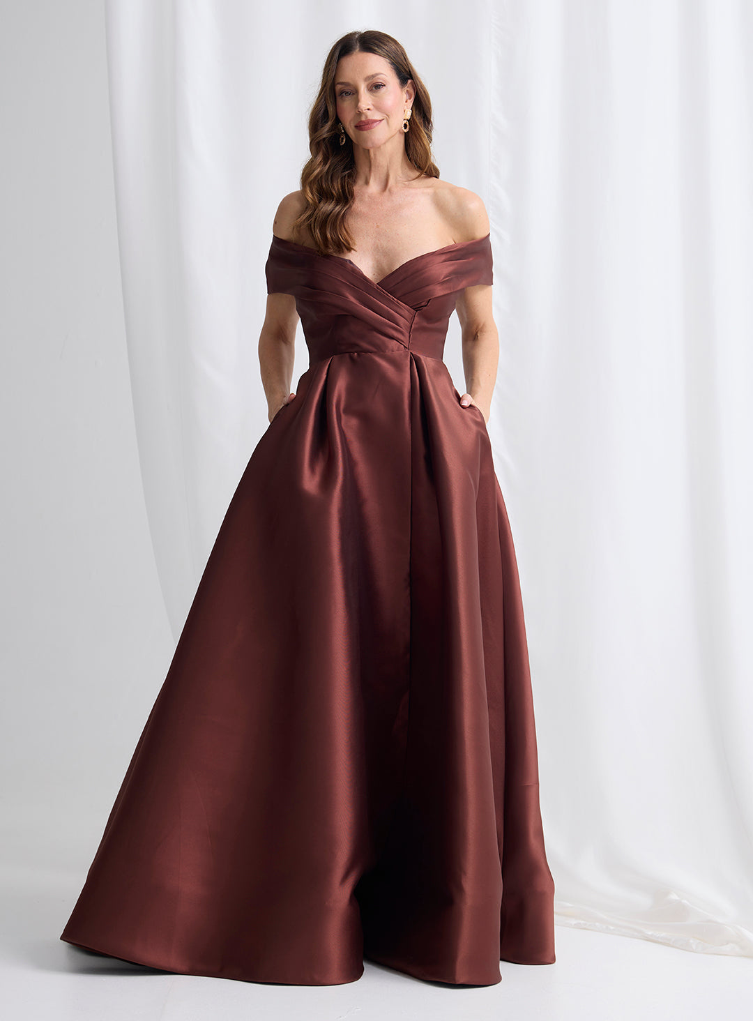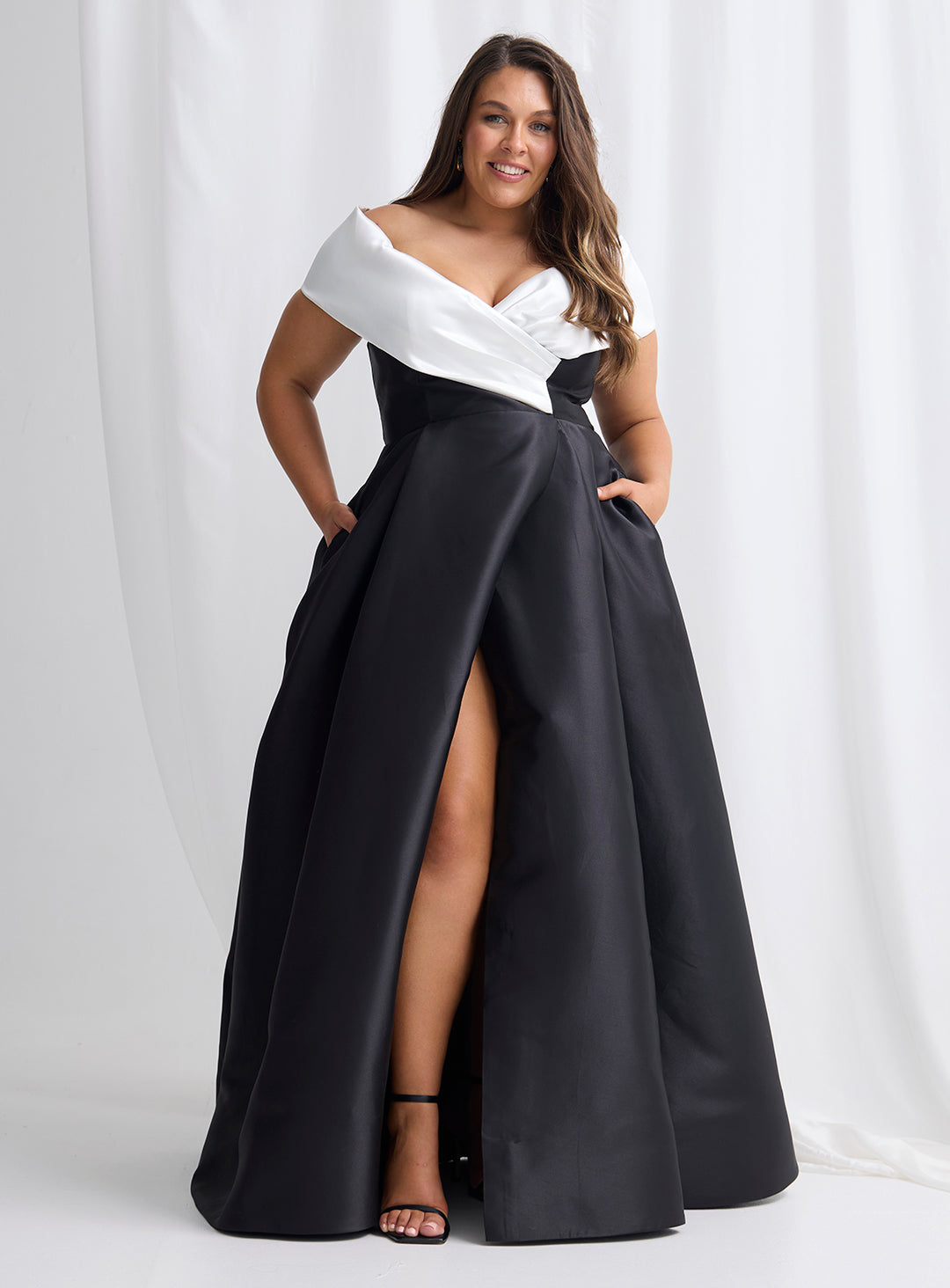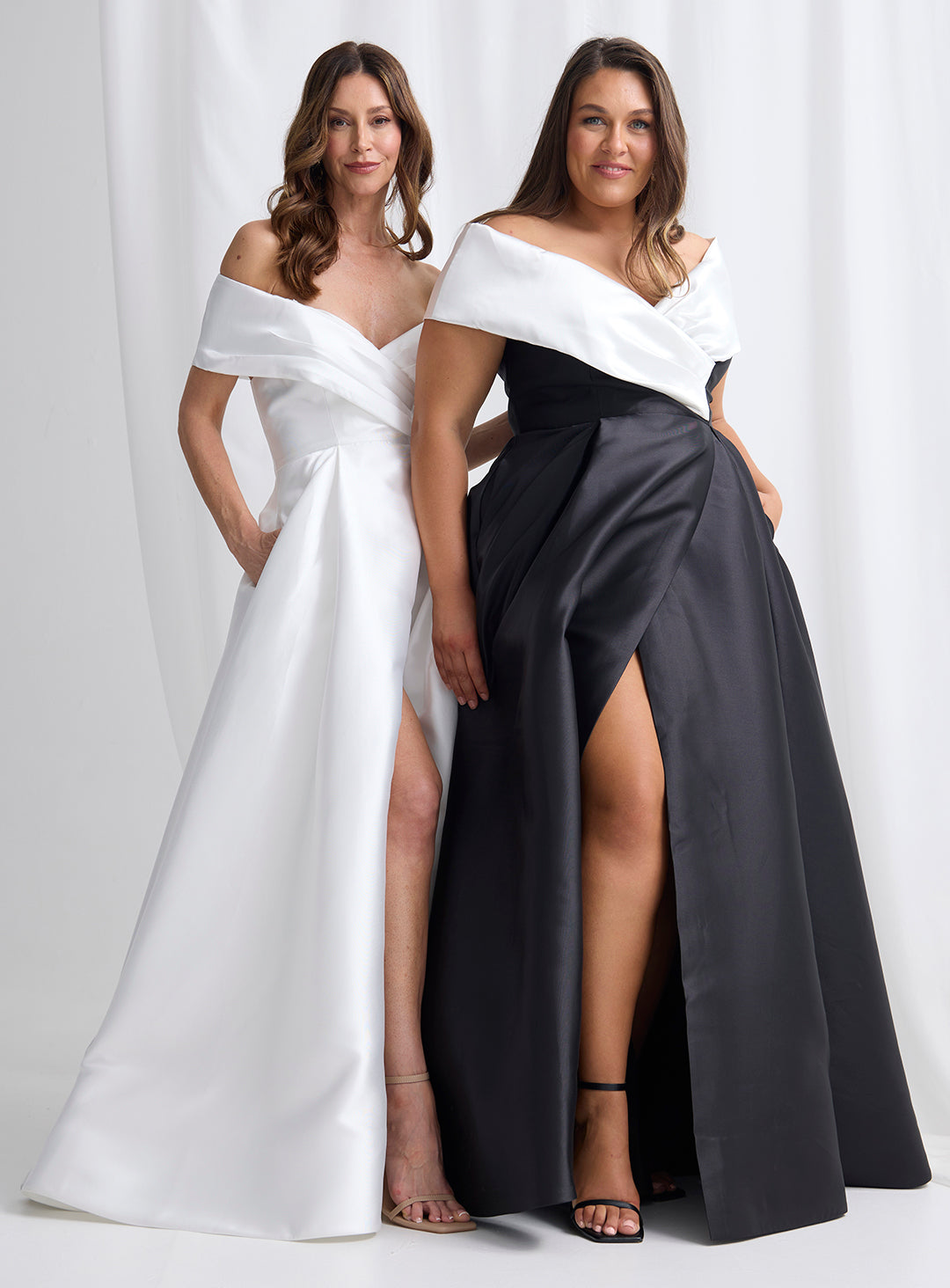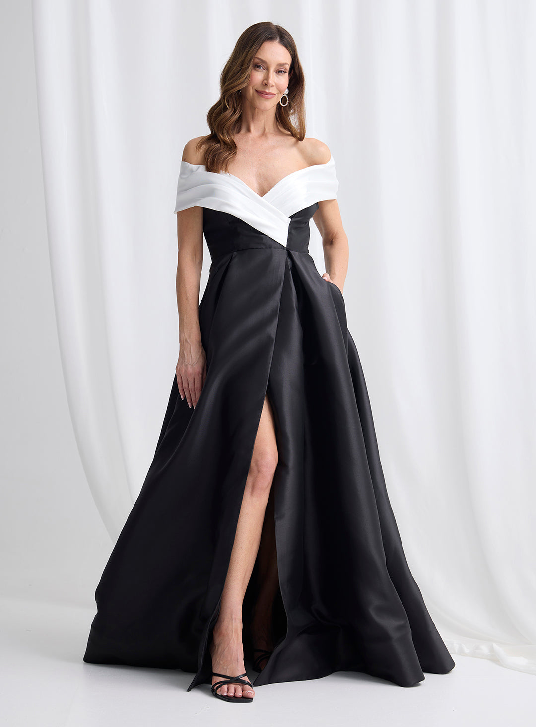A gorgeous gown by Trellis Lane. A flattering off-the-shoulder design, featuring a wrap styled flare skirt with leg split.