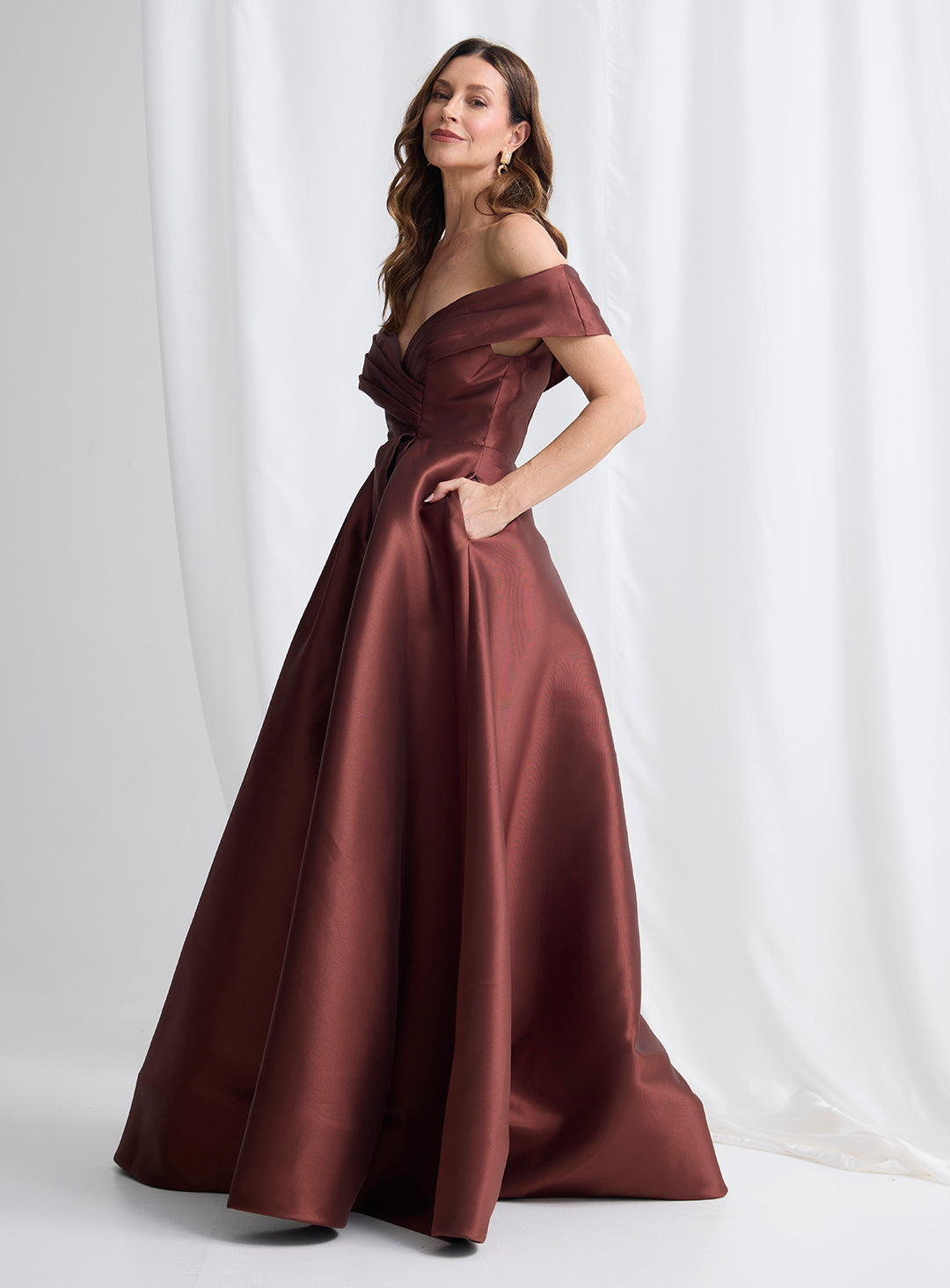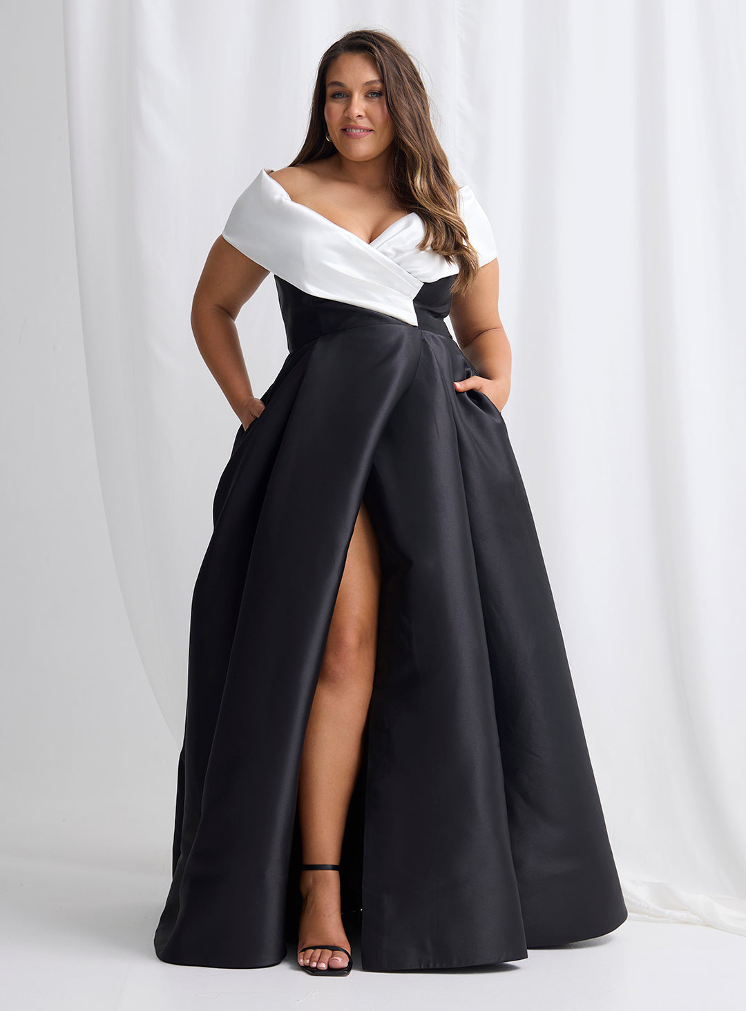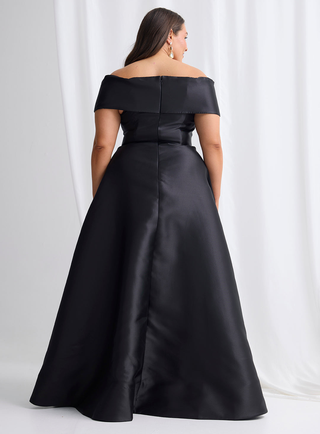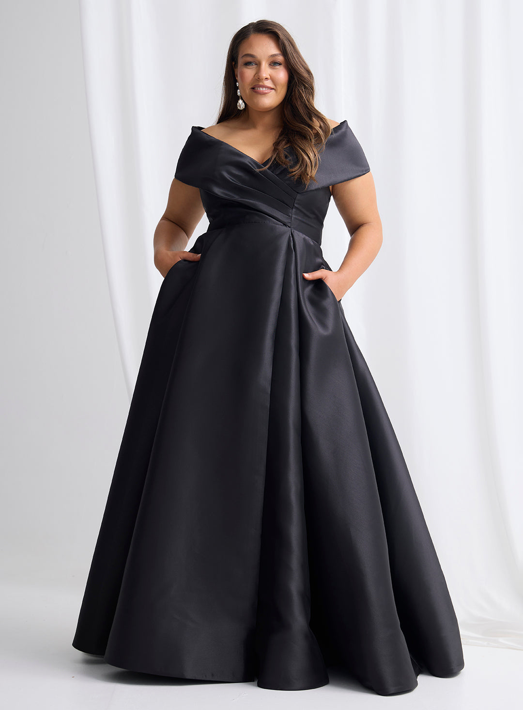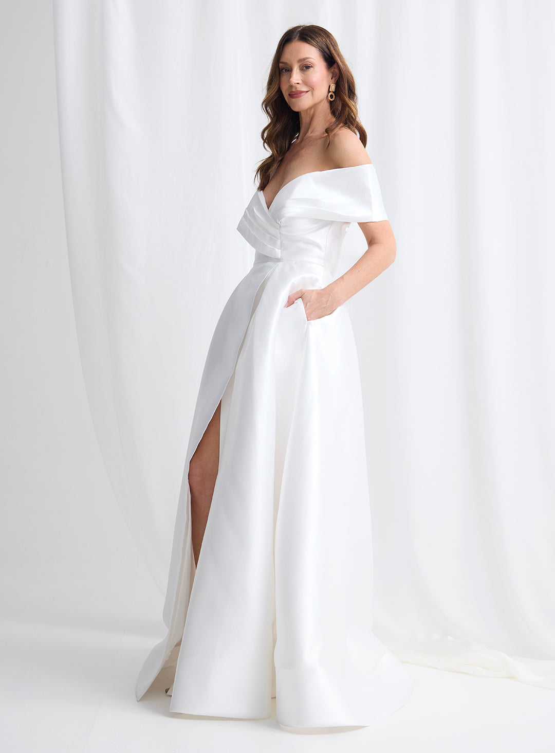 A gorgeous gown by Trellis Lane. A flattering off-the-shoulder design, featuring a wrap styled flare skirt with leg split.
