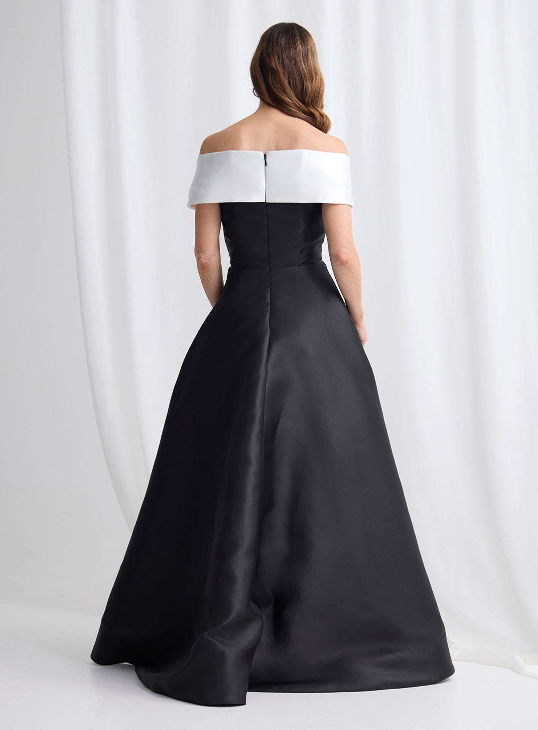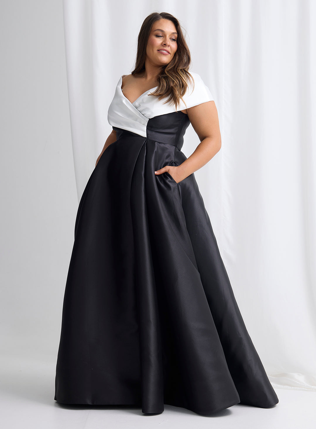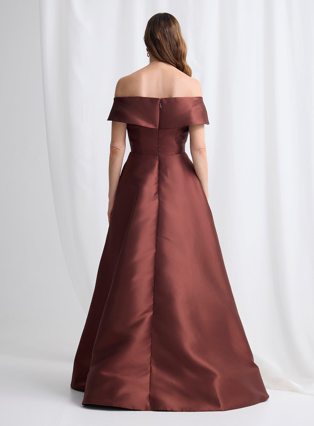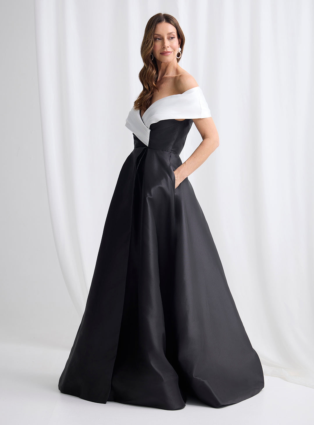 A gorgeous gown by Trellis Lane. A flattering off-the-shoulder design, featuring a wrap styled flare skirt with leg split.