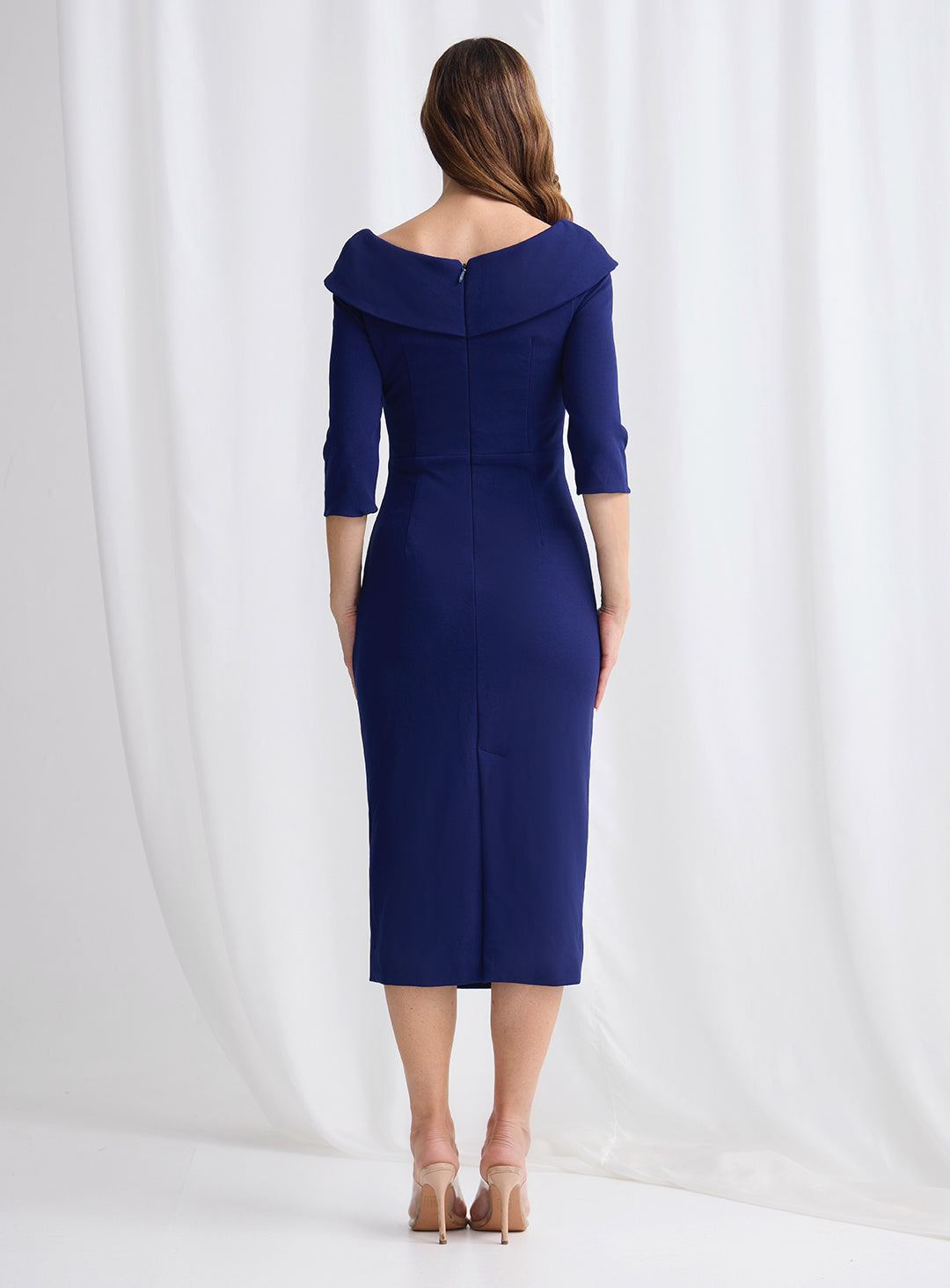 A gorgeous dress by Trellis Lane. A flattering design crafted in a gorgeous soho stretch jersey featuring an asymmetric neckline, 3/4 sleeves and ruching across skirt.