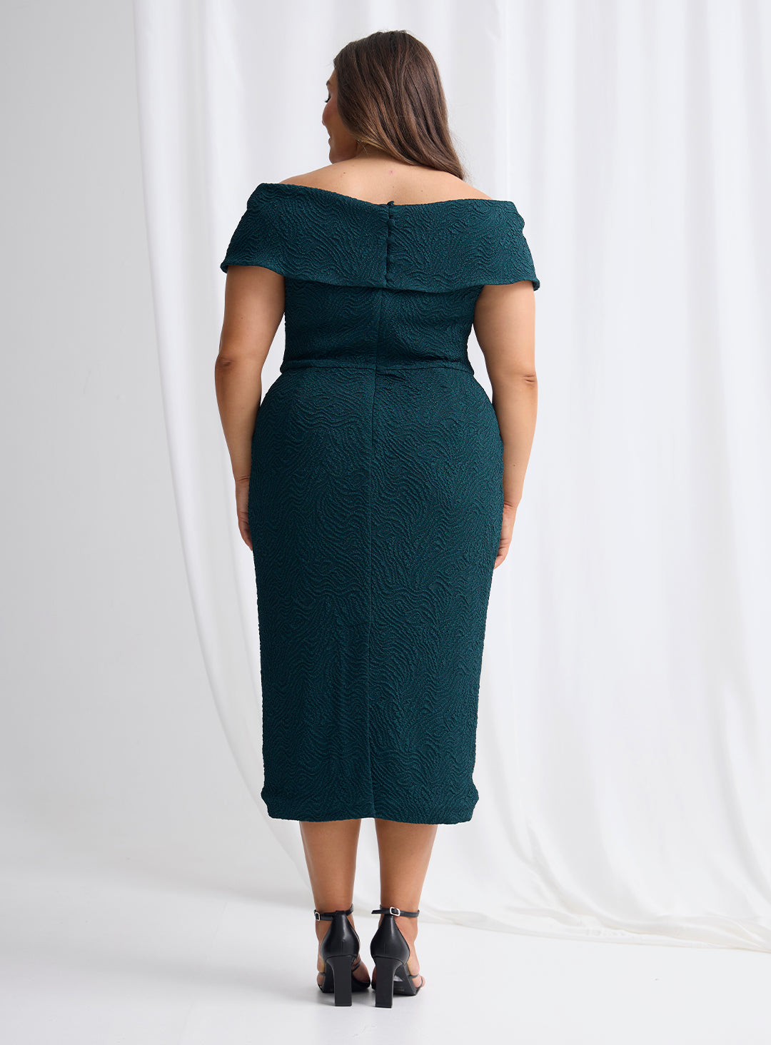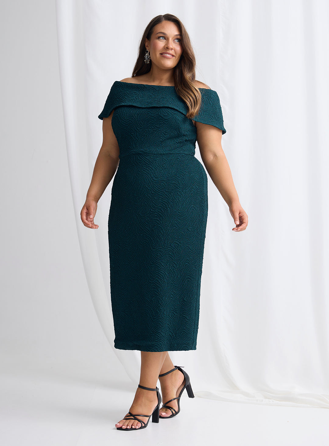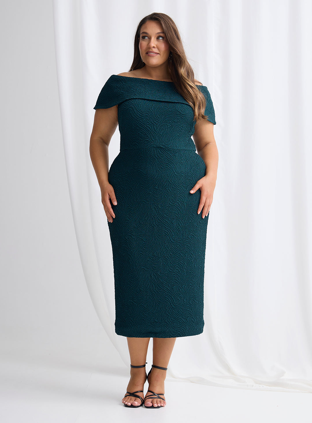 A gorgeous midi dress by Trellis Lane. A cocktail style featuring a scooped neckline to be worn on the shoulders with a bodice overlay and button details at the back.