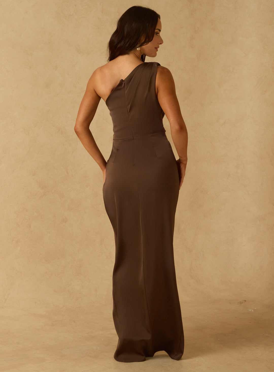 A gorgeous full length dress by Sofia Cali. A satin style featuring a one shoulder, thigh split, ruching on the bodice a wrap style skirt.