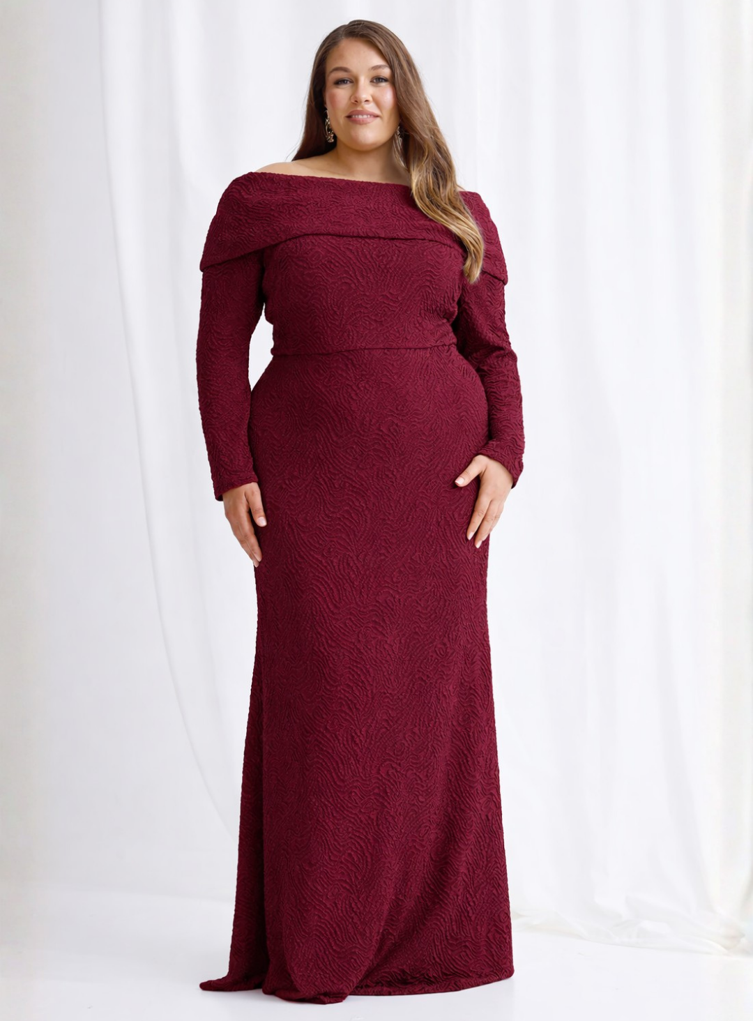 A beautiful full length gown by Trellis Lane. Featuring a scooped neckline to be worn on the shoulders with a bodice overlay and button details at the back.
