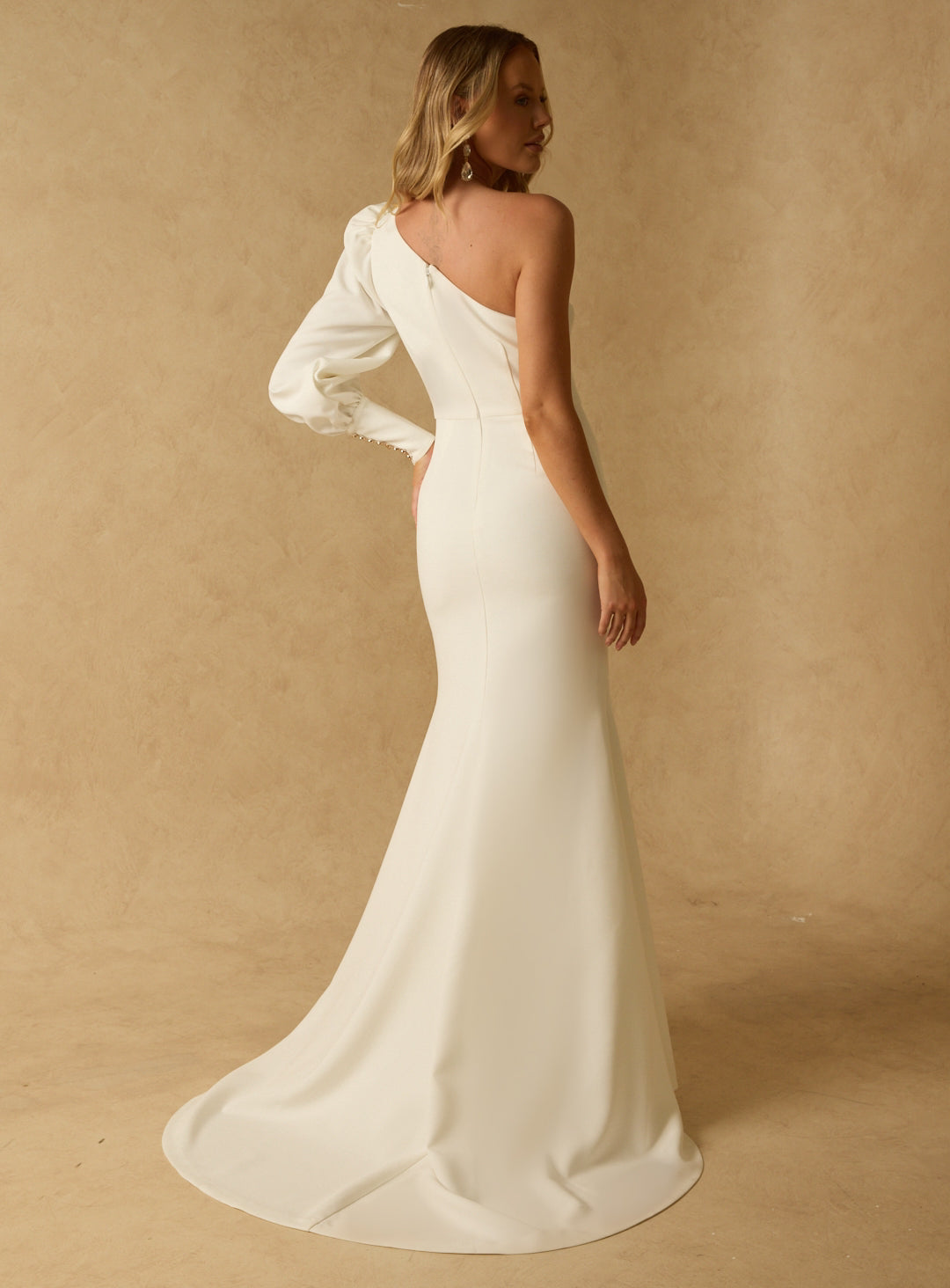 A gorgeous full length gown by Samantha Rose. Made from a thick stretch crepe fabric, this one sleeve style is super flattering with a puff sleeve, thigh high split and floor sweeping train.