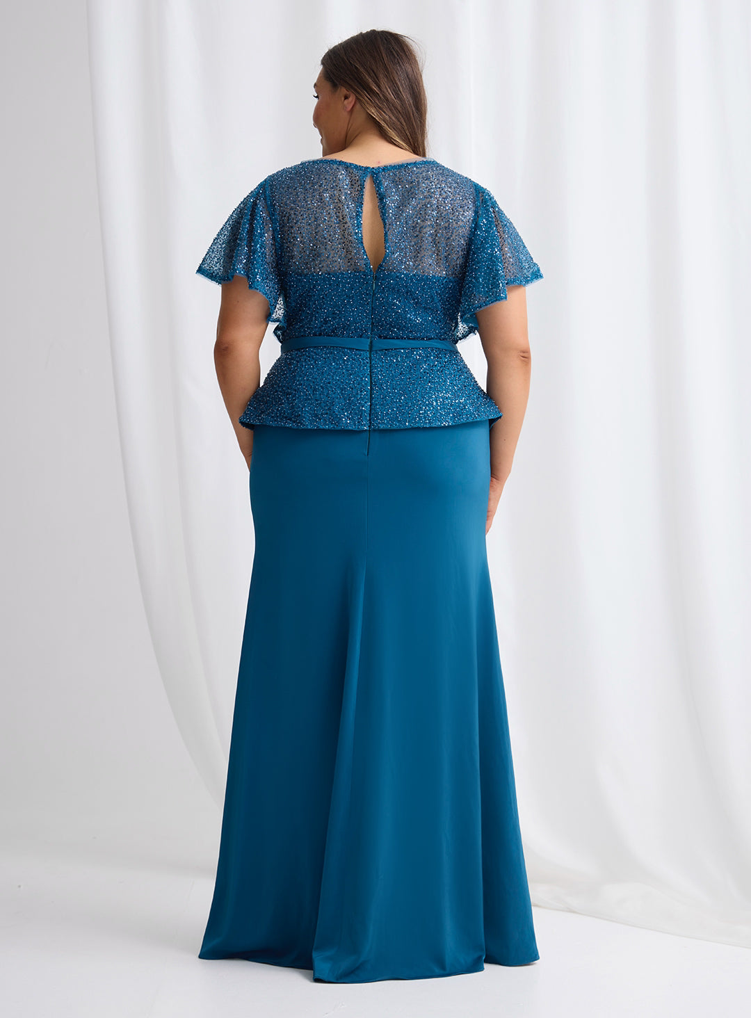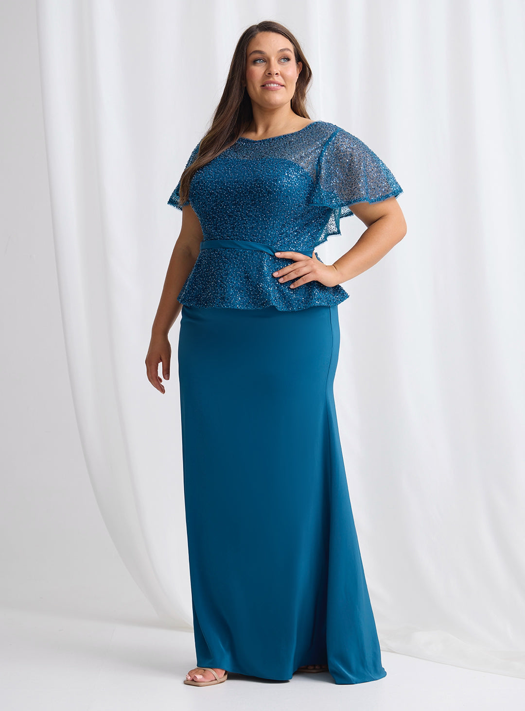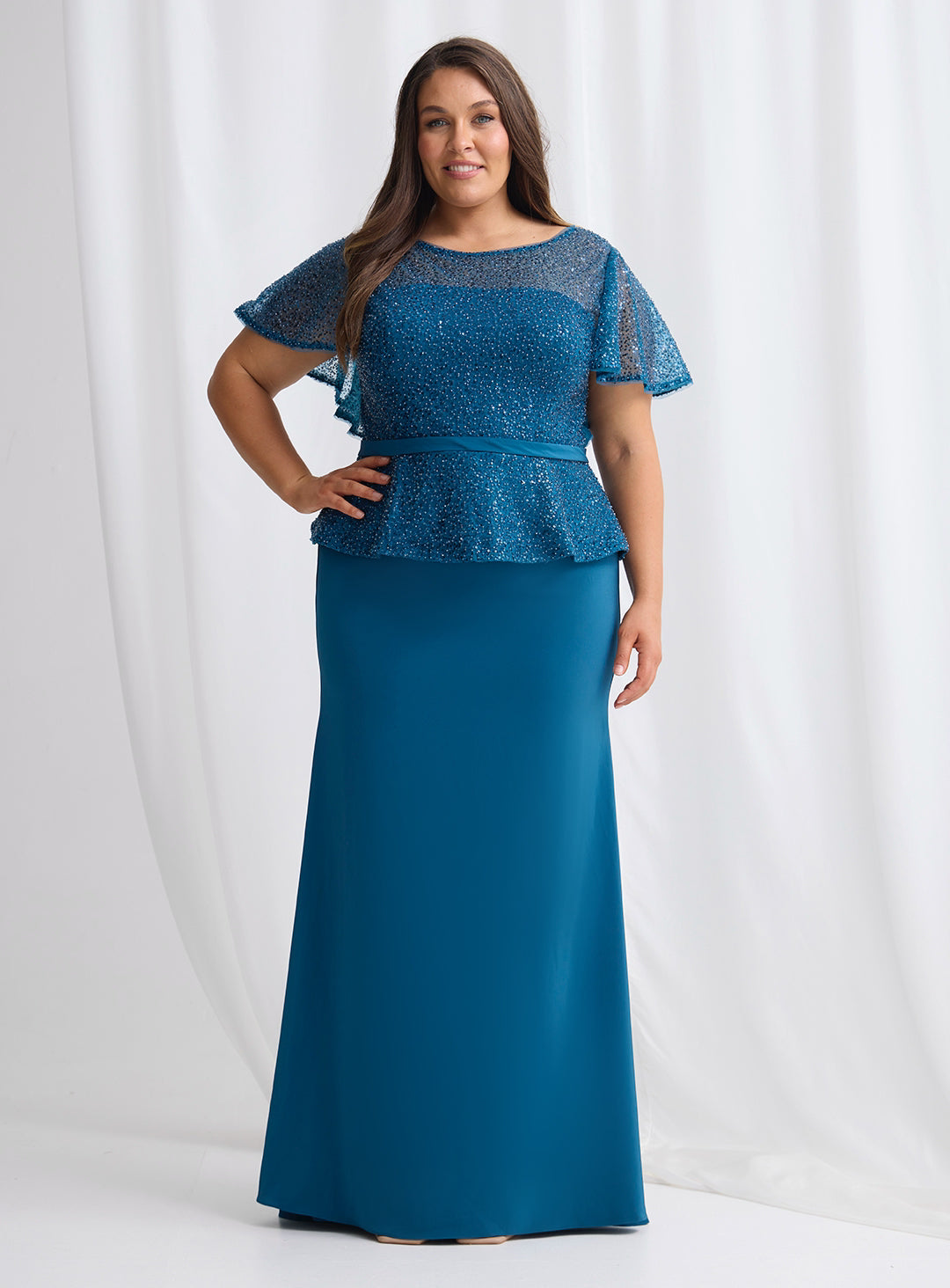 A gorgeous full length dress by Trellis Lane. Features a high neckline with sheer detailing and flowy cap sleeves. Bodice is crafted from a delicate beaded fabric, with flattering peplum detail at the waist. Skirt is made from a woven satin crepe with flattering ruched details.