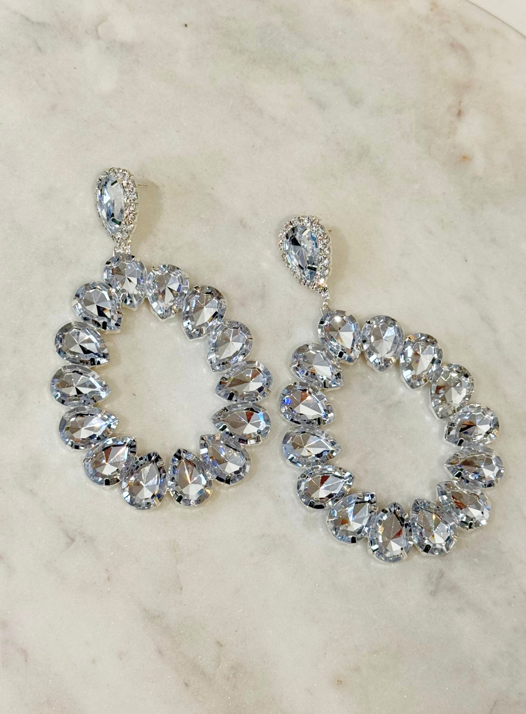 A gorgeous pair of oversized earrings. Featuring a large oval drop with crystals and a diamante halo stud.