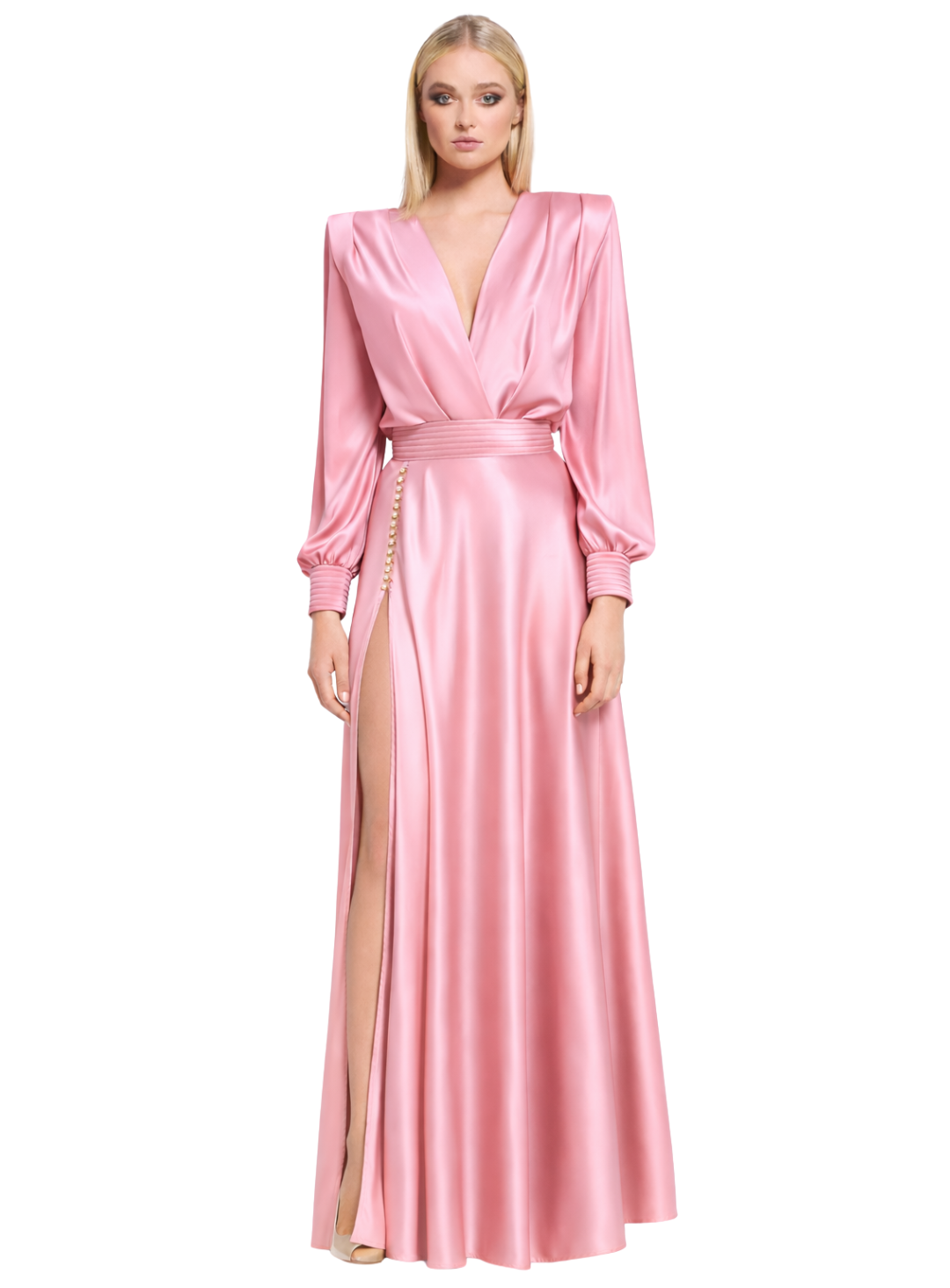 A gorgeous gown by Zhivago. A bias cut full length gown with billowed sleeves, satin paneling and front split with button and loop closures.