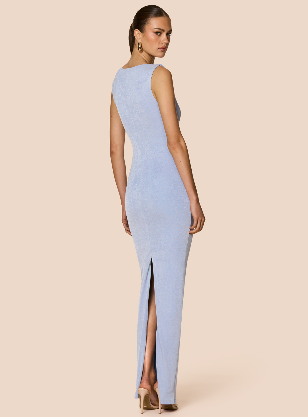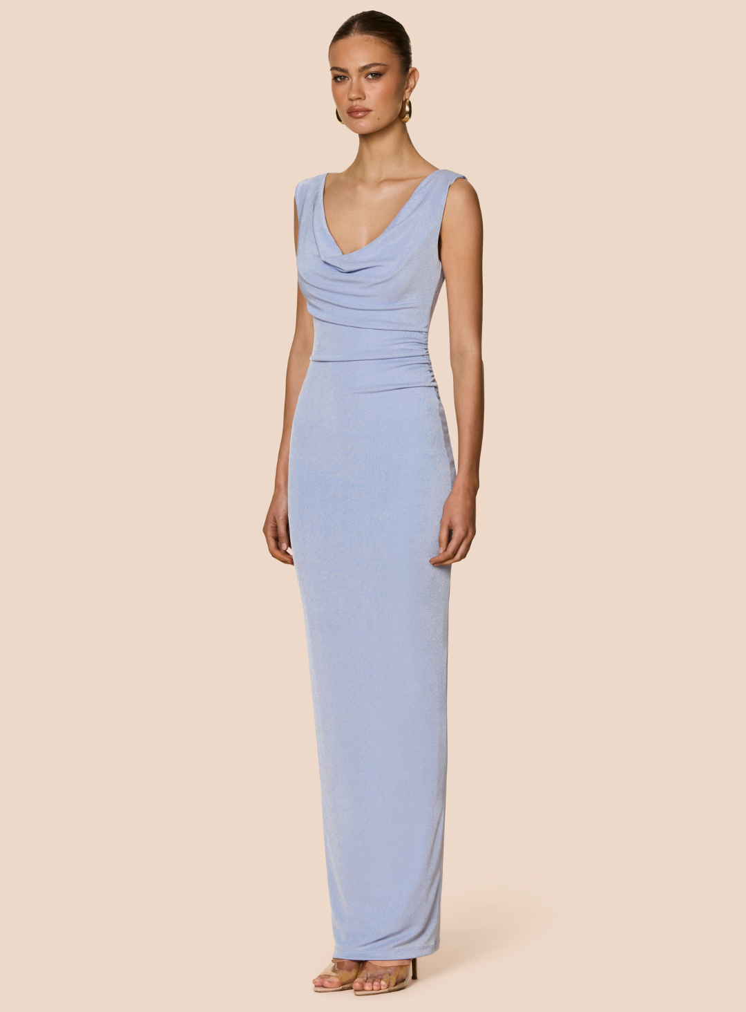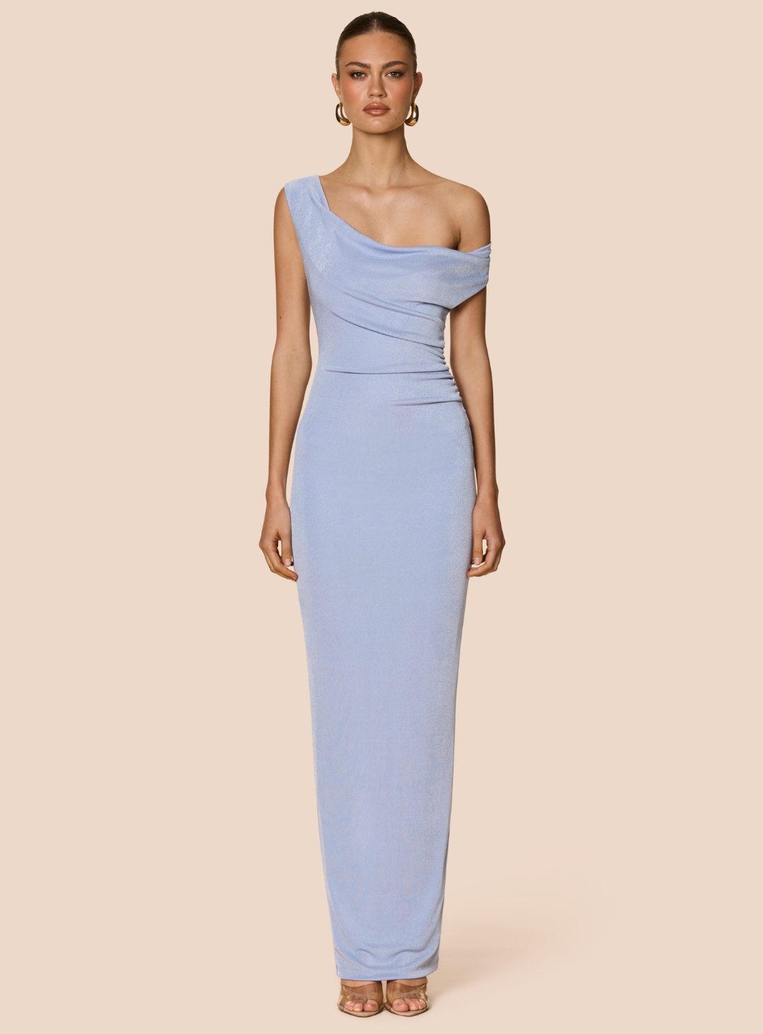 The multi-way wear adds a modern touch, while subtle ruching through the waist creates a sculpted, feminine shape. Falling to a floor-length hem, the design is finished with a centre-back split for ease of movement and a graceful finish.