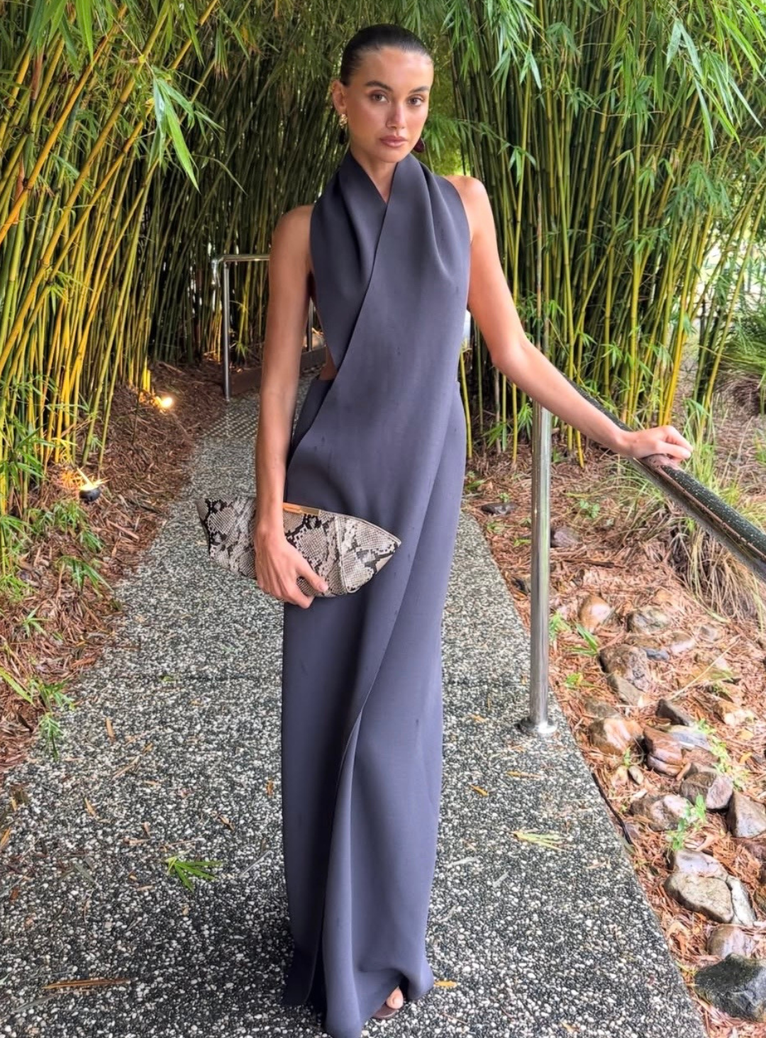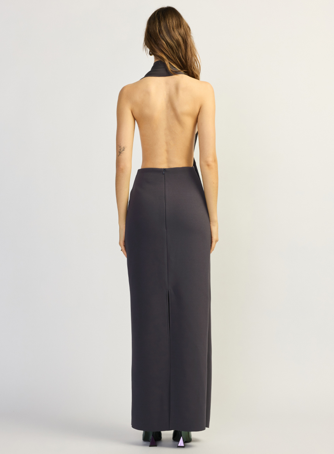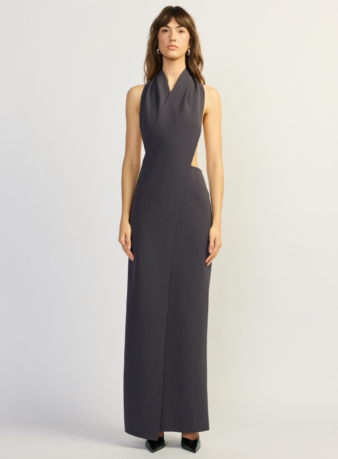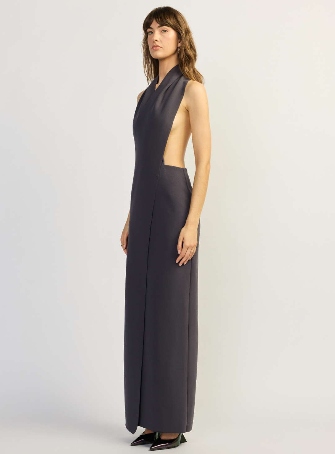 The dramatic open back adds a bold, sophisticated edge, while subtle side cut-outs enhance the waist for a flattering, sculpted fit. Falling to a full-length hem with a centre-back split for ease of movement, this gown is the perfect balance of contemporary design and effortless elegance.