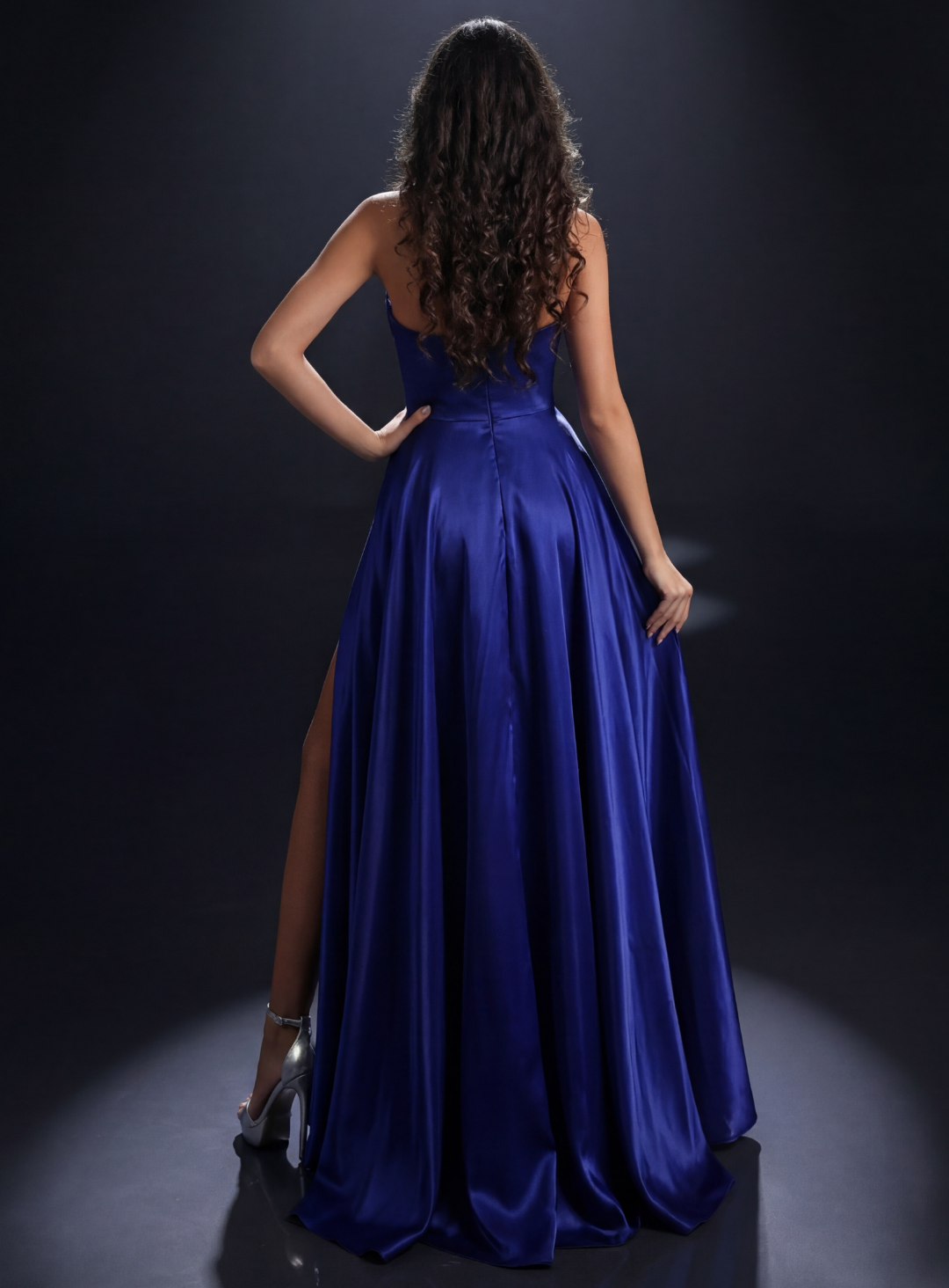 The gown flows into a dramatic full skirt that moves effortlessly with every step, complete with a daring thigh-high split for a touch of modern glamour. Crafted in a lustrous satin that catches the light beautifully, this gown is perfect for formals, black-tie events, and special occasions where elegance takes centre stage.