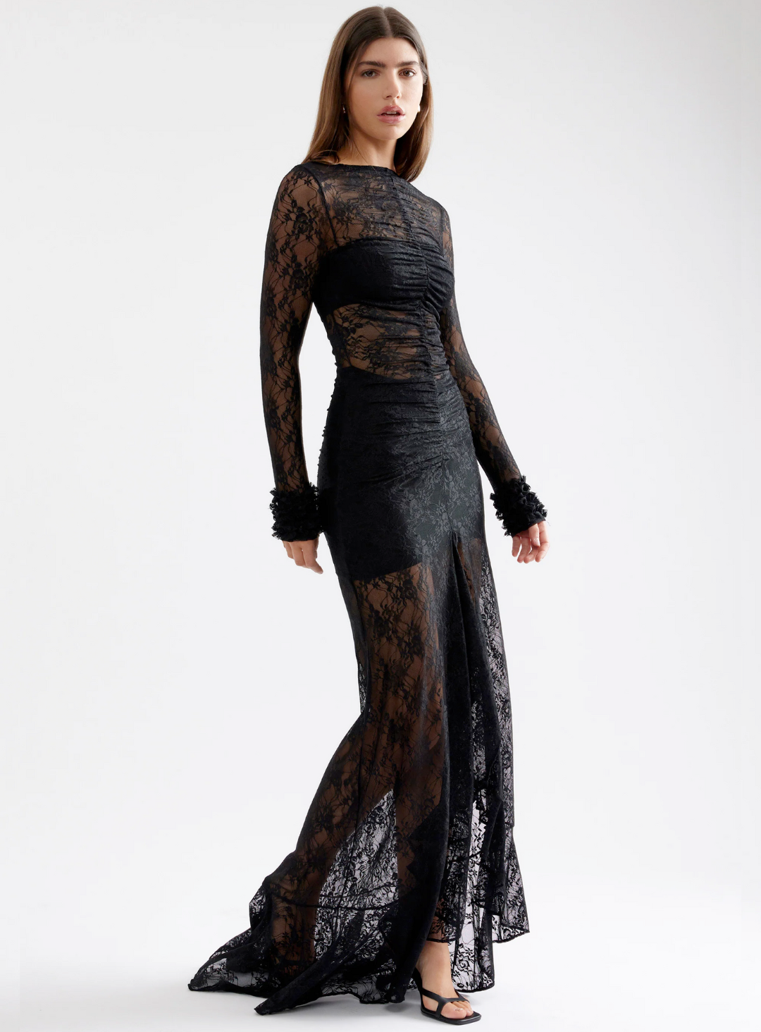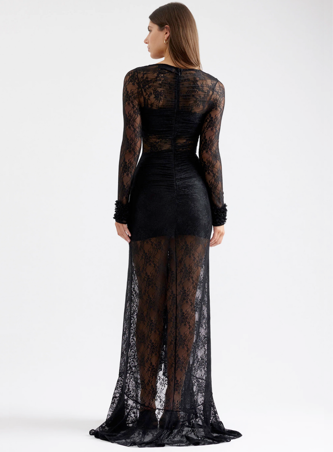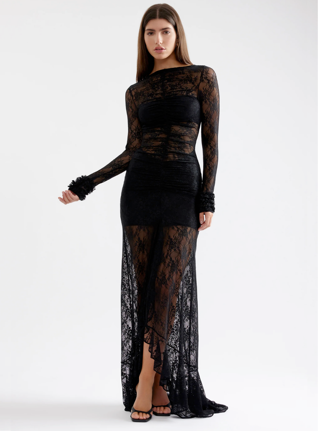 Crafted from delicate sheer lace fabric, the dress features a high neckline and long fitted sleeves that create an elegant, elongated silhouette. The bodice is softly structured with subtle ruching through the centre, adding depth and contour while allowing the delicate pattern to take focus.