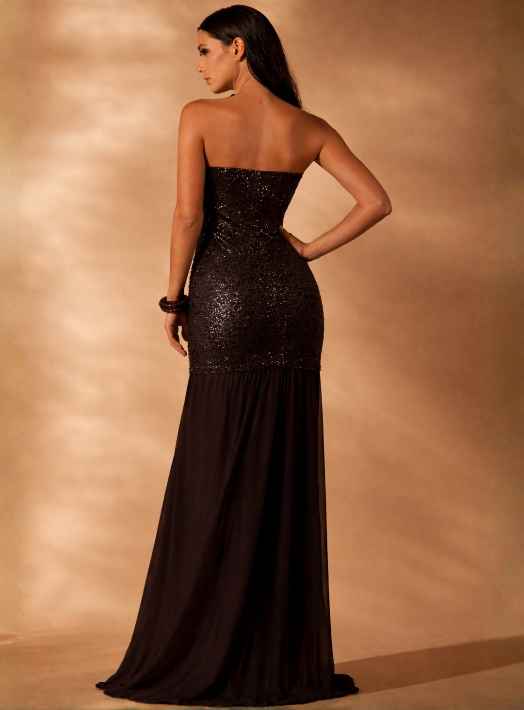 The fitted bodice hugs the waist and hips before flowing into a soft chiffon floor-length skirt that adds elegant movement and balance. Finished with an open back for added allure, this gown is perfect for black-tie events, formal occasions, and unforgettable evenings.