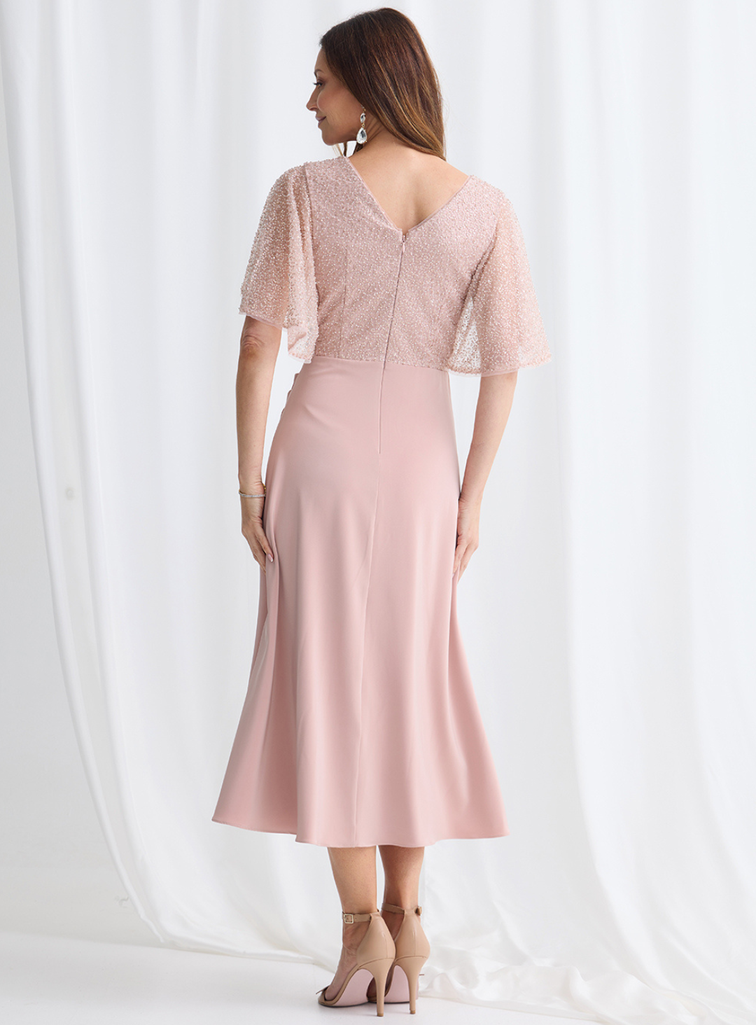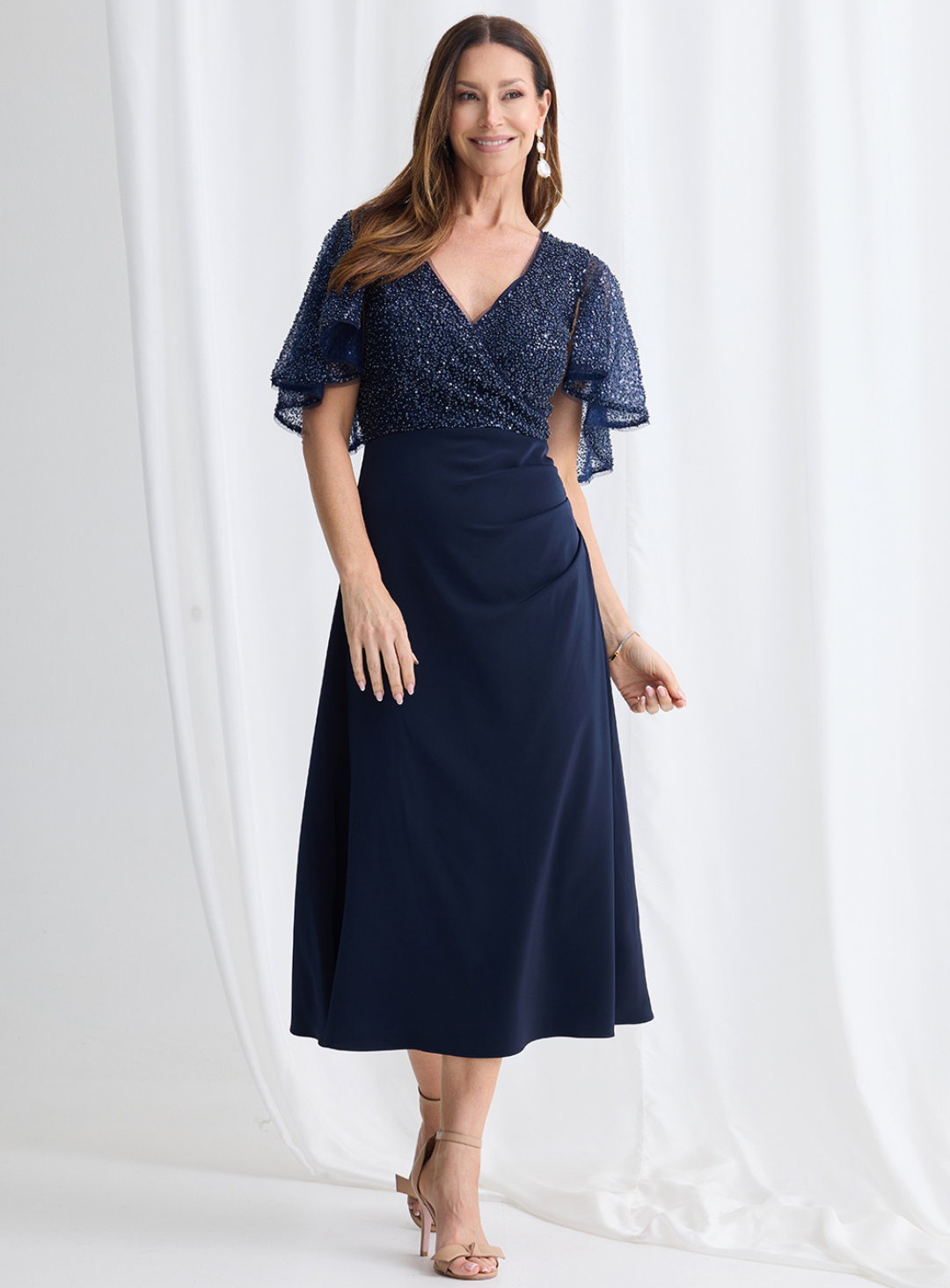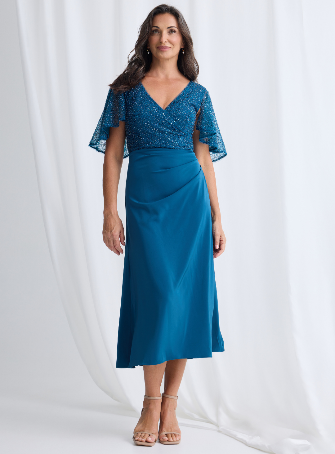 A gorgeous midi length dress by Trellis Lane. Features a beaded bodice with v-neckline with sheer flowy cap sleeves. Skirt is made from a woven satin crepe with flattering ruched details.