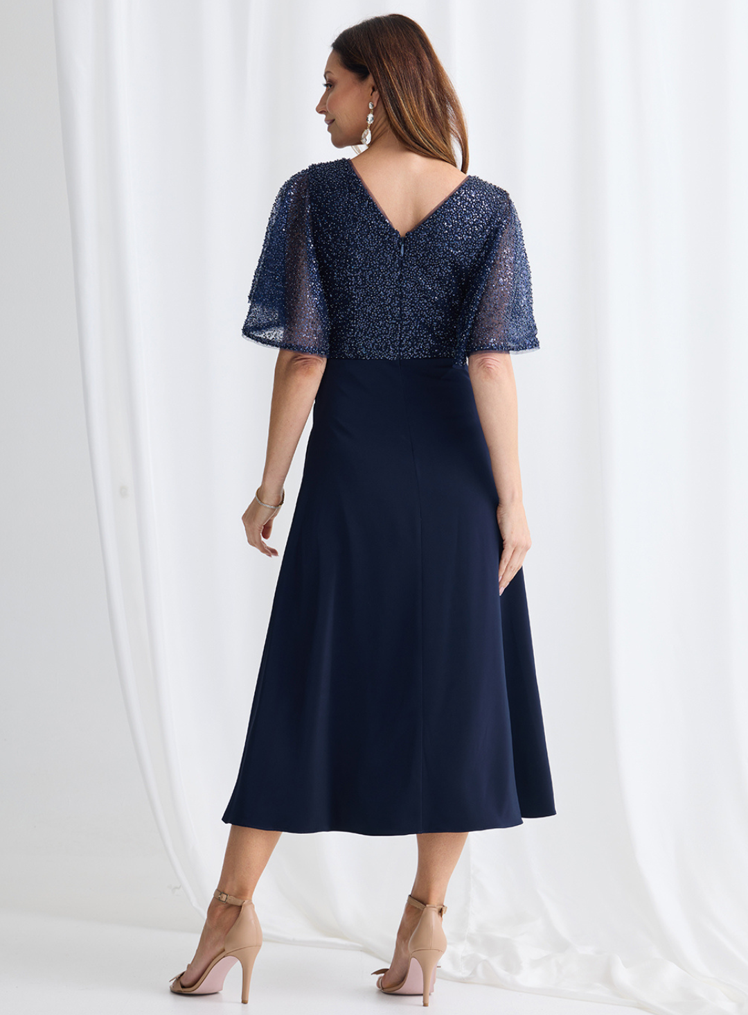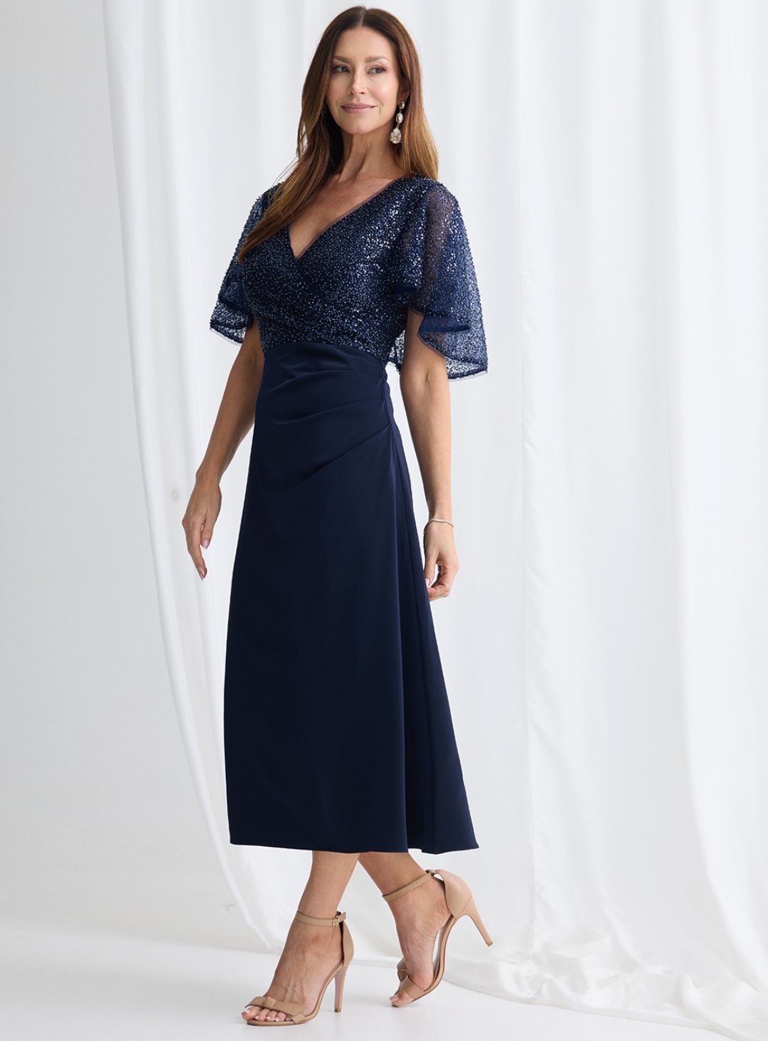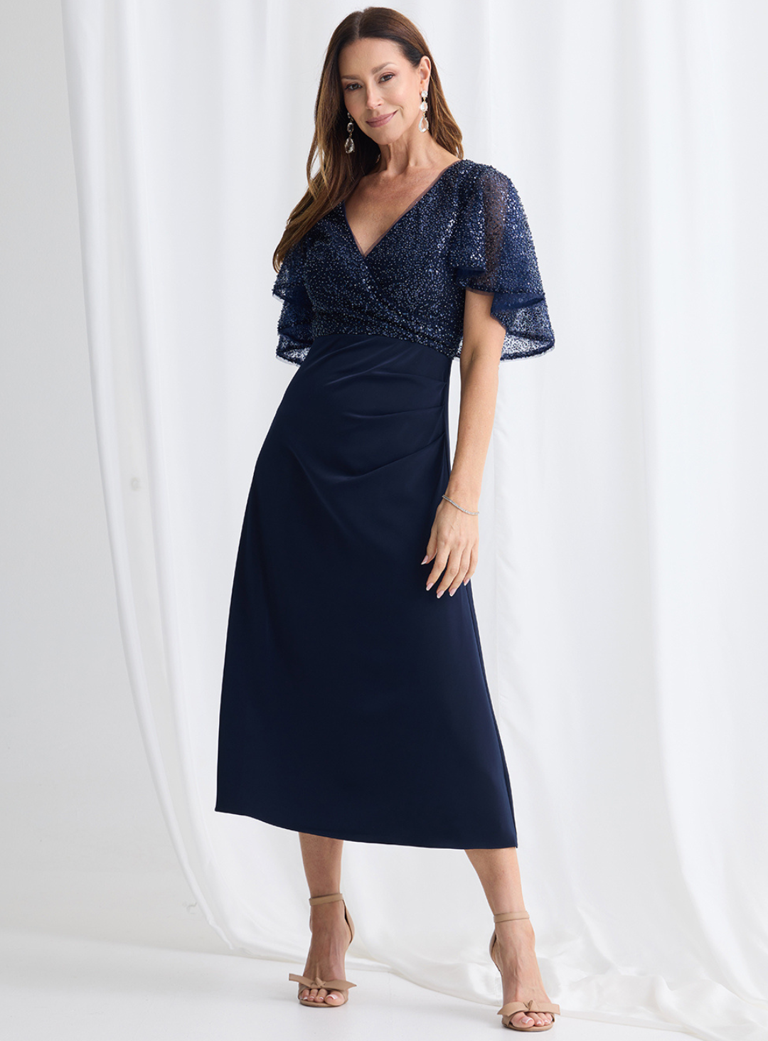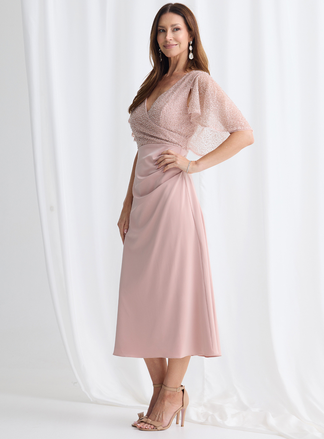 A gorgeous midi length dress by Trellis Lane. Features a beaded bodice with v-neckline with sheer flowy cap sleeves. Skirt is made from a woven satin crepe with flattering ruched details.