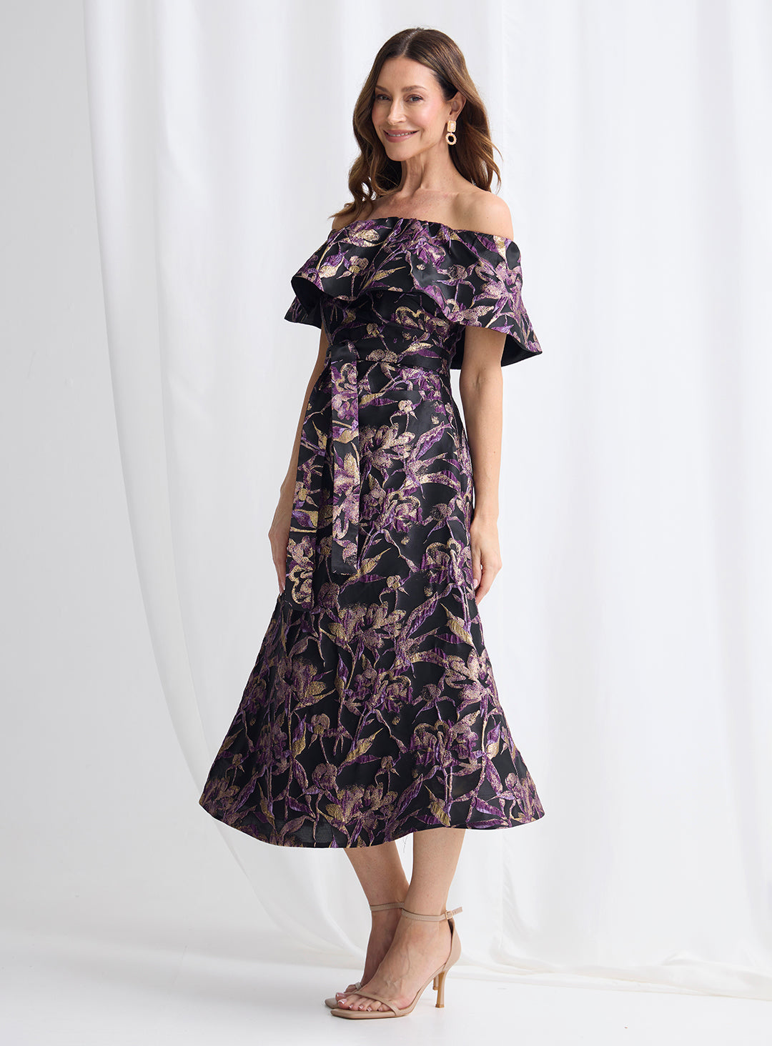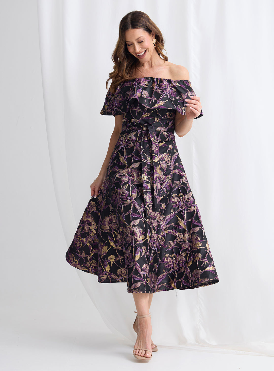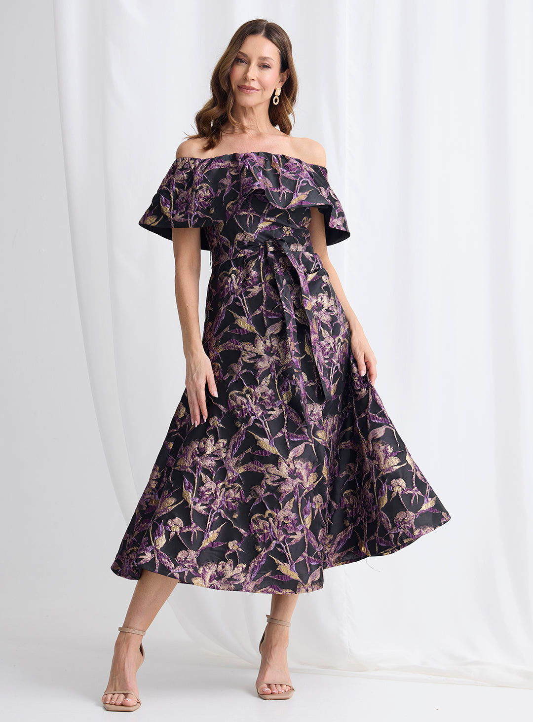 A stunning midi dress by Trellis Lane. Designed with an elegant off-the-shoulder neckline, the softly structured bodice highlights the décolletage while providing a flattering, feminine shape. A coordinating waist tie cinches the silhouette, enhancing definition before flowing into a full midi skirt with graceful volume and movement.