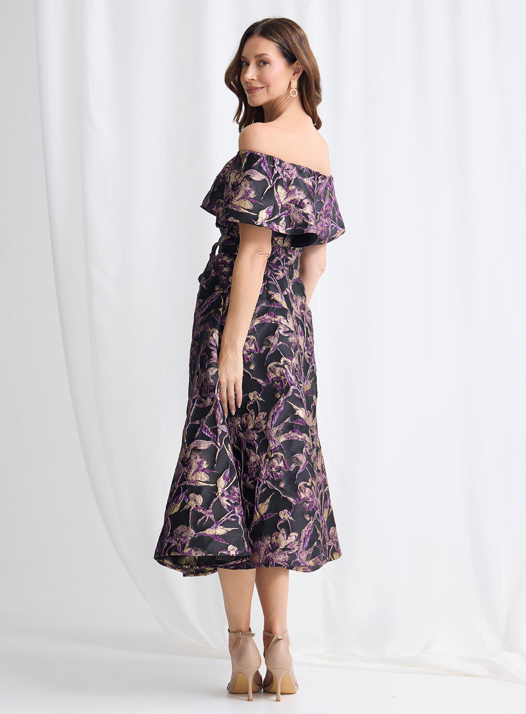 The fabric features a striking floral jacquard with a subtle metallic sheen that catches the light beautifully. Perfect for special occasions, this piece blends classic elegance with a modern, polished finish.