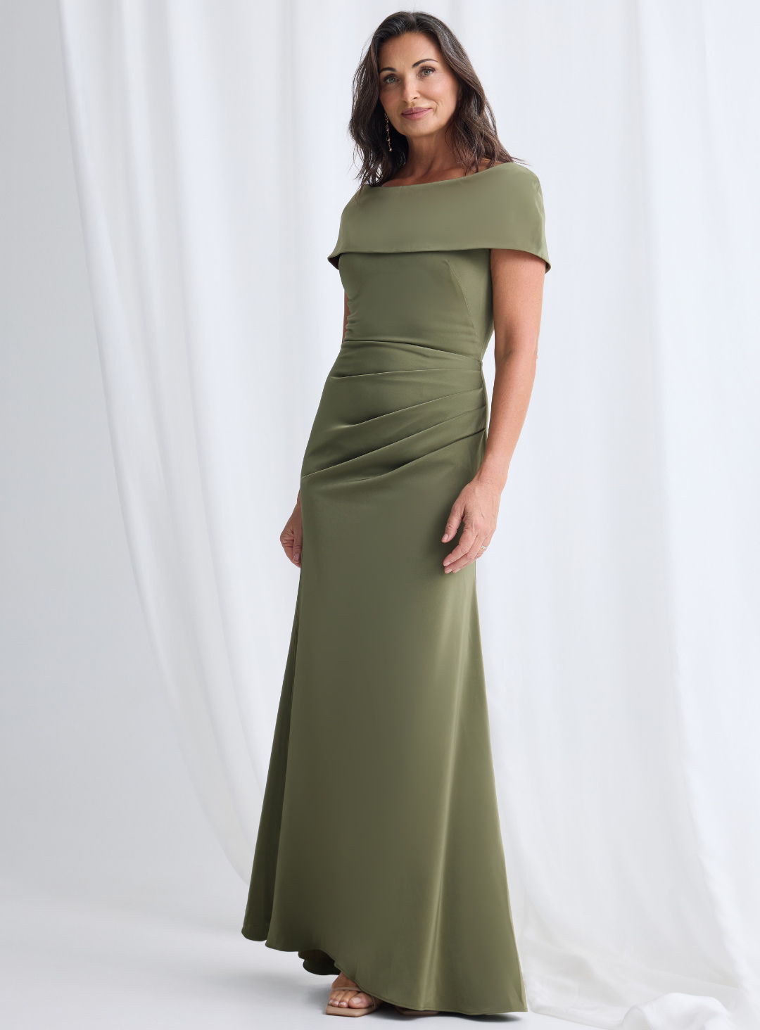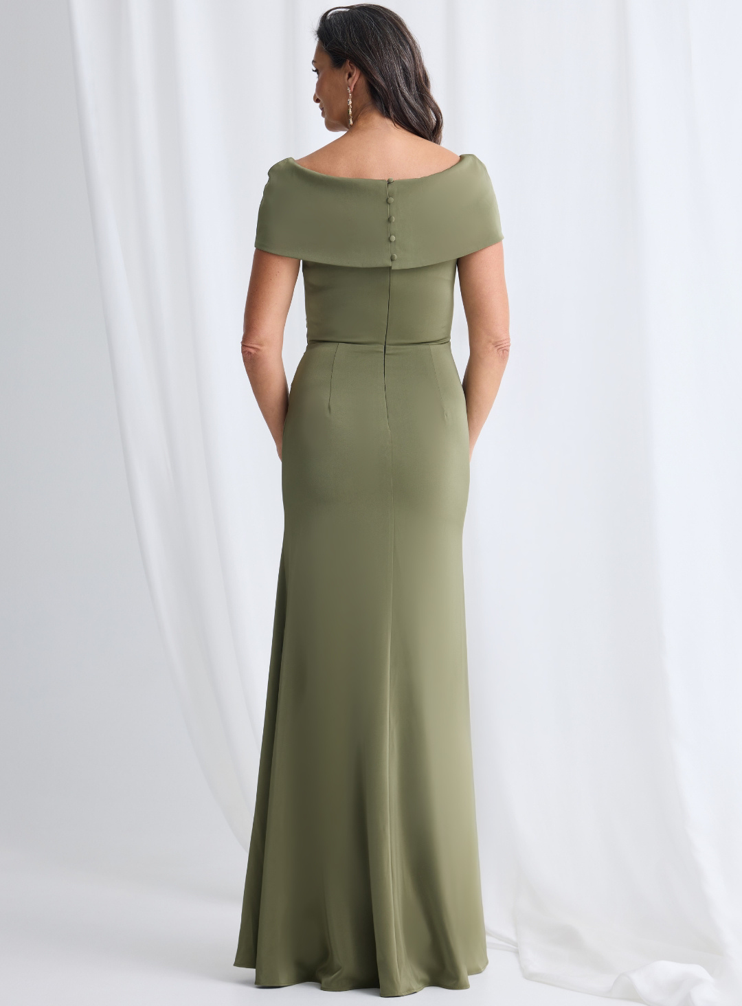 A gorgeous full length dress by Trellis Lane. Featuring an off shoulder overlay with button closure. A mermaid skirt with ruching makes for a flattering fit!