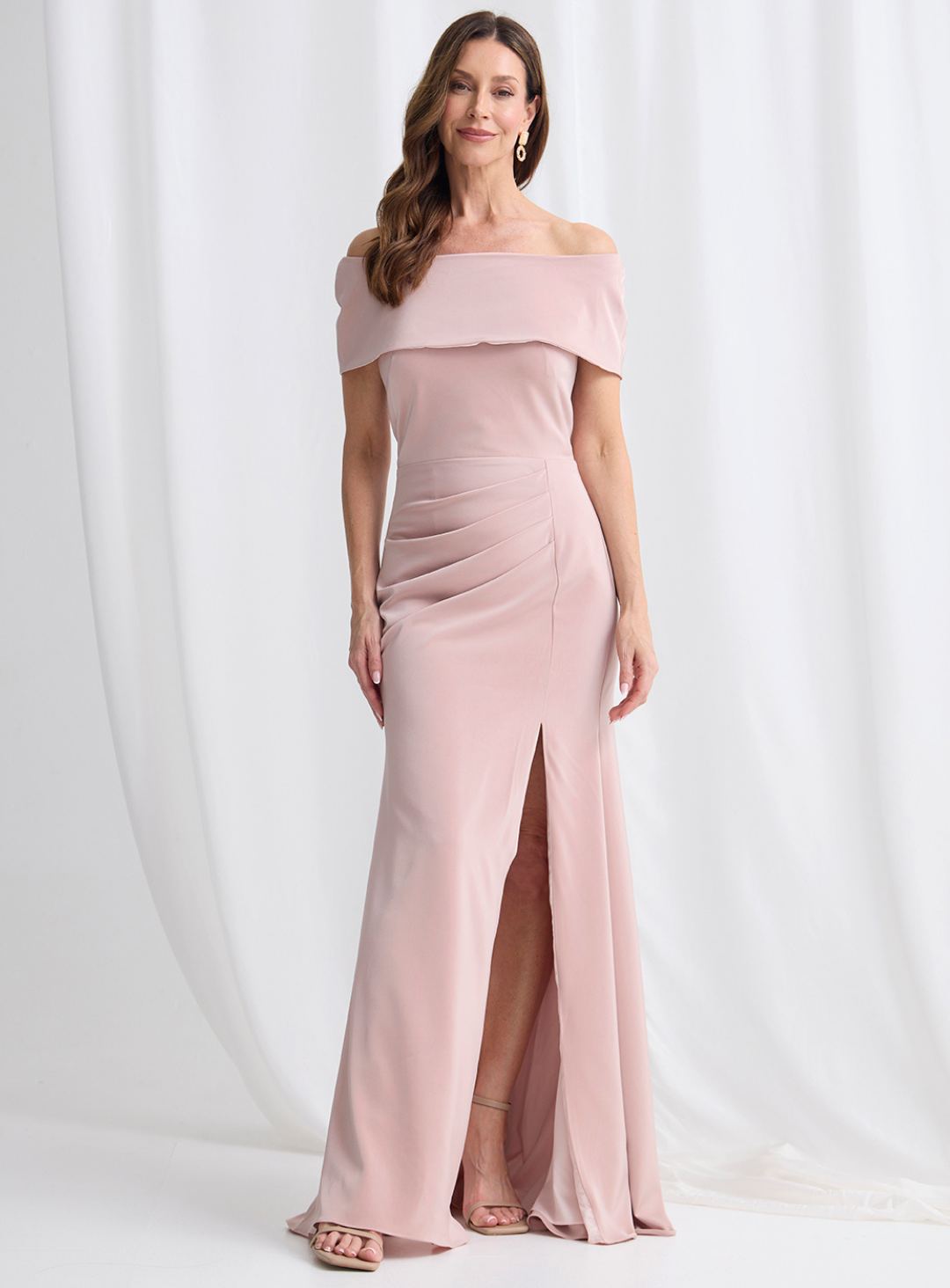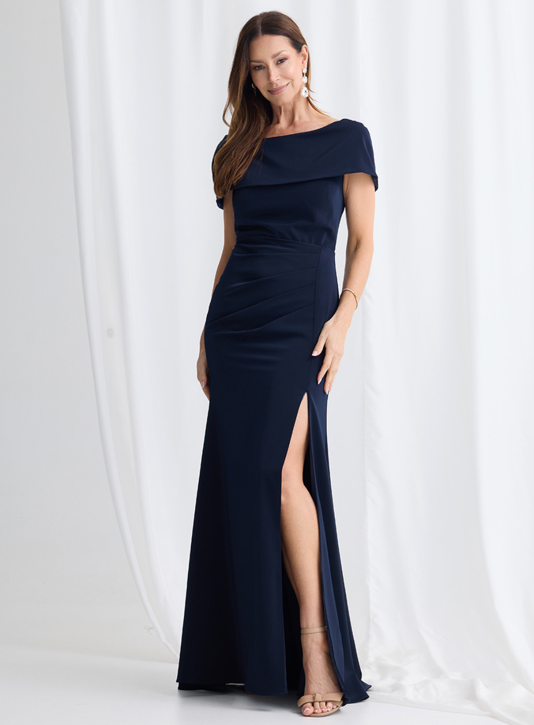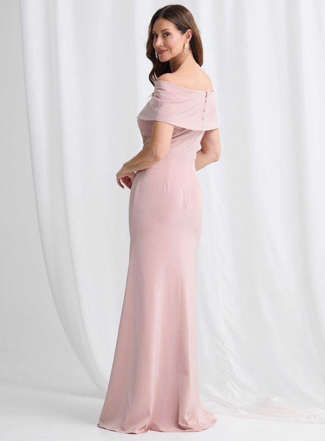 A gorgeous gown by Trellis Lane, perfect for mother of the bride/groom or wedding guest! An elegant off shoulder design featuring a mermaid skirt with button closures on the yolk and a thigh high split. The small train adds elegance and drama!