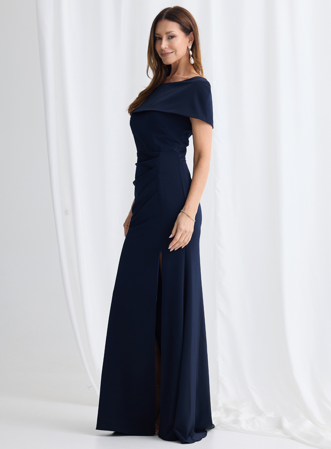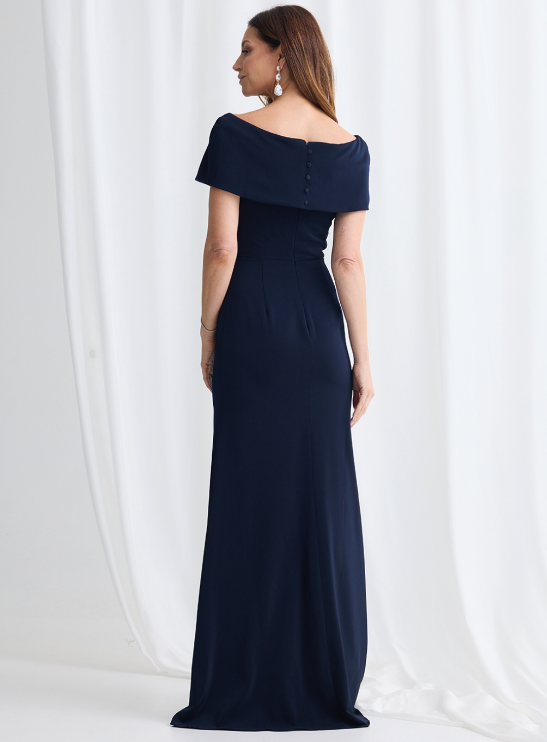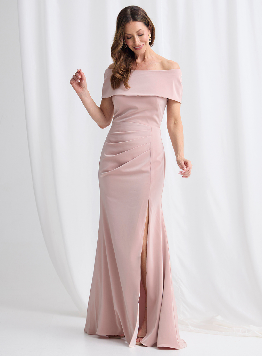 A gorgeous gown by Trellis Lane, perfect for mother of the bride/groom or wedding guest! An elegant off shoulder design featuring a mermaid skirt with button closures on the yolk and a thigh high split. The small train adds elegance and drama!