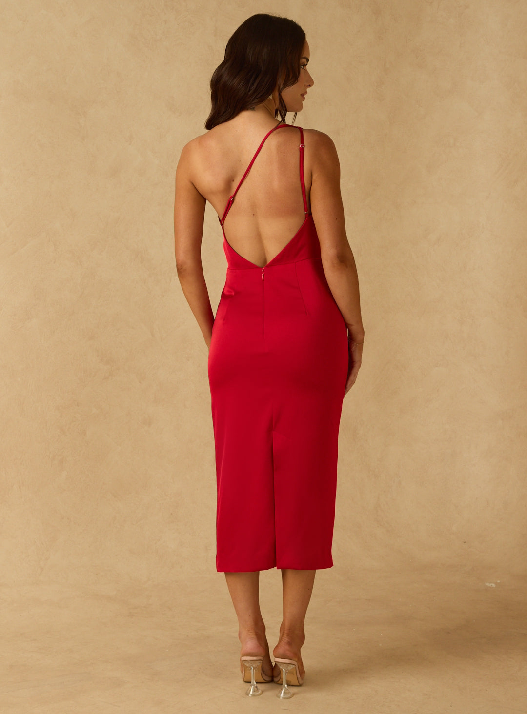 A gorgeous midi length dress by Sofia Cali. A satin style featuring a low back, thigh split, ruching on the bodice and a midi pencil skirt.