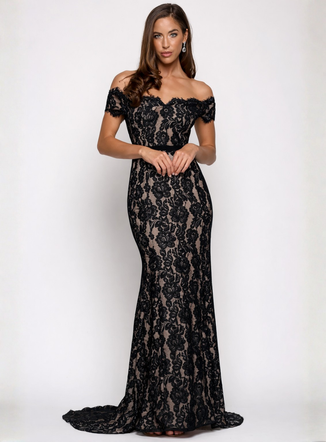 A beautiful gown by Trellis Lane. An off shoulder style featuring a sweetheart neckline and eyelash scallop lace details along the bodice and sleeves.