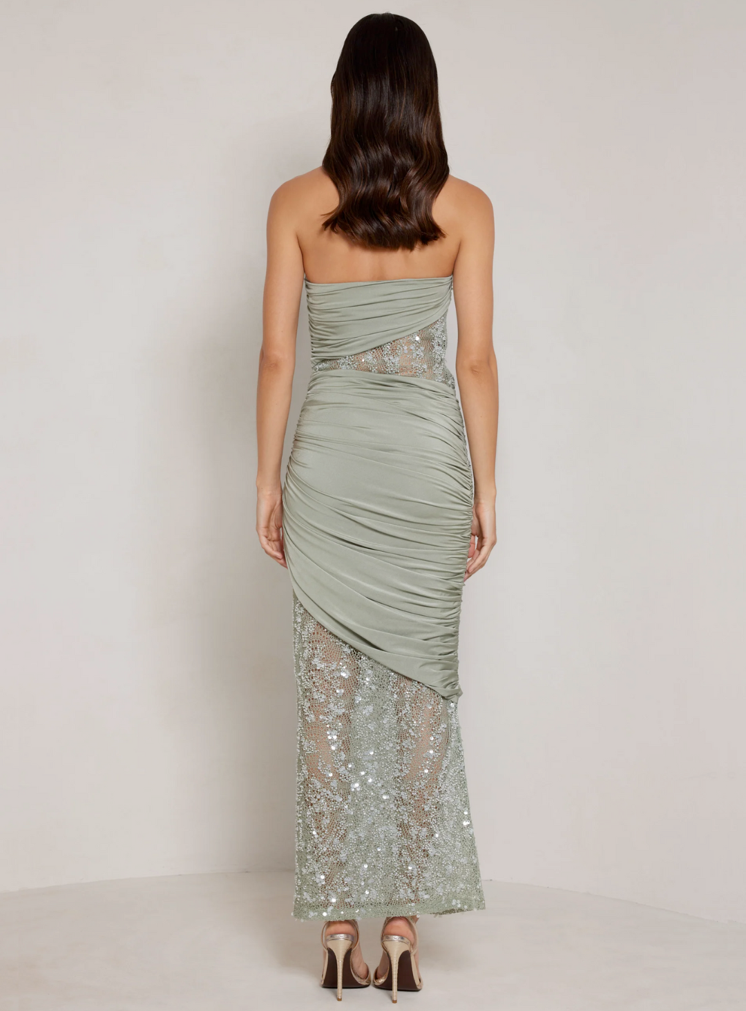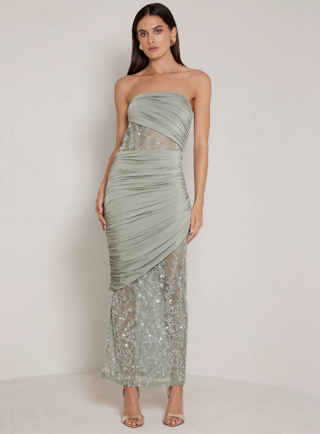 The sage Journee Dress by Elle Zeitoune is the perfect wedding guest dress. A strapless stretch jersey dress featuring a sheer lace panel across the waist and hemline. The softly ruched design creates a flattering, sculpted fit, while the sheer embellished panels add a subtle touch of interest.