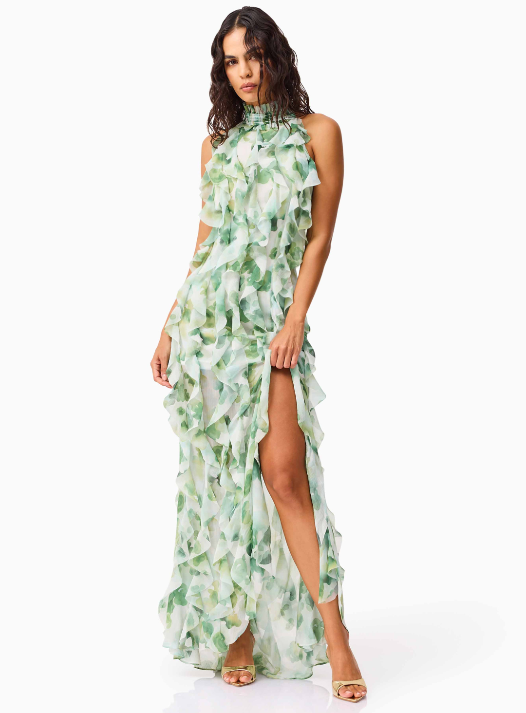 The Solene Gown is a gorgeous full length dress by Elliatt. Crafted from beautifully printed georgette fabrication, it features a refined collared neckline and cascading tiered ruffles that create soft movement and romantic dimension. Effortlessly elegant, this flowing silhouette is perfect for weddings, garden parties, or any special occasion that calls for timeless femininity.