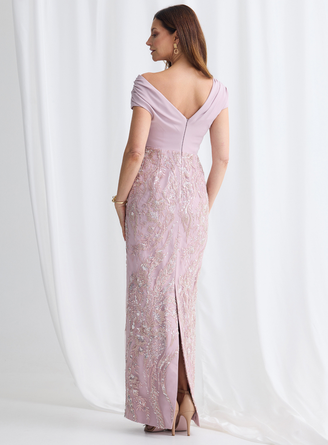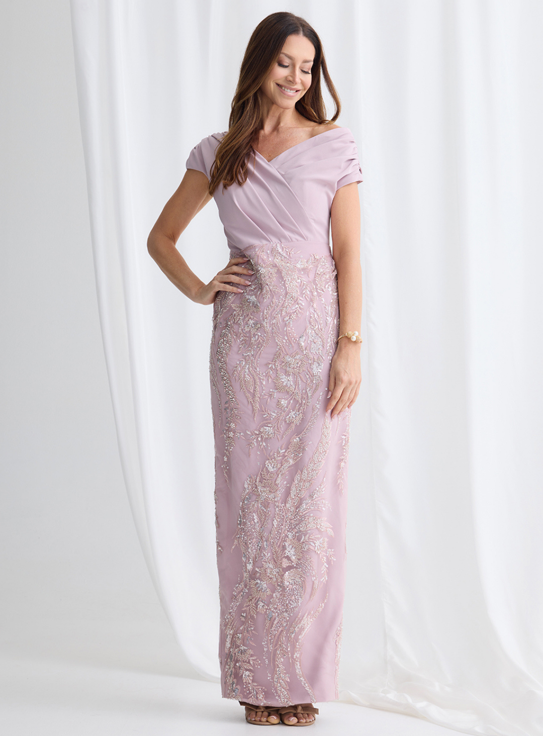 A gorgeous pencil dress by Trellis Lane, perfect for mother of the bride/groom or wedding guest! An elegant off shoulder design featuring a beaded pencil skirt, plain bodice with off shoulder straps and a centre back split for movement.