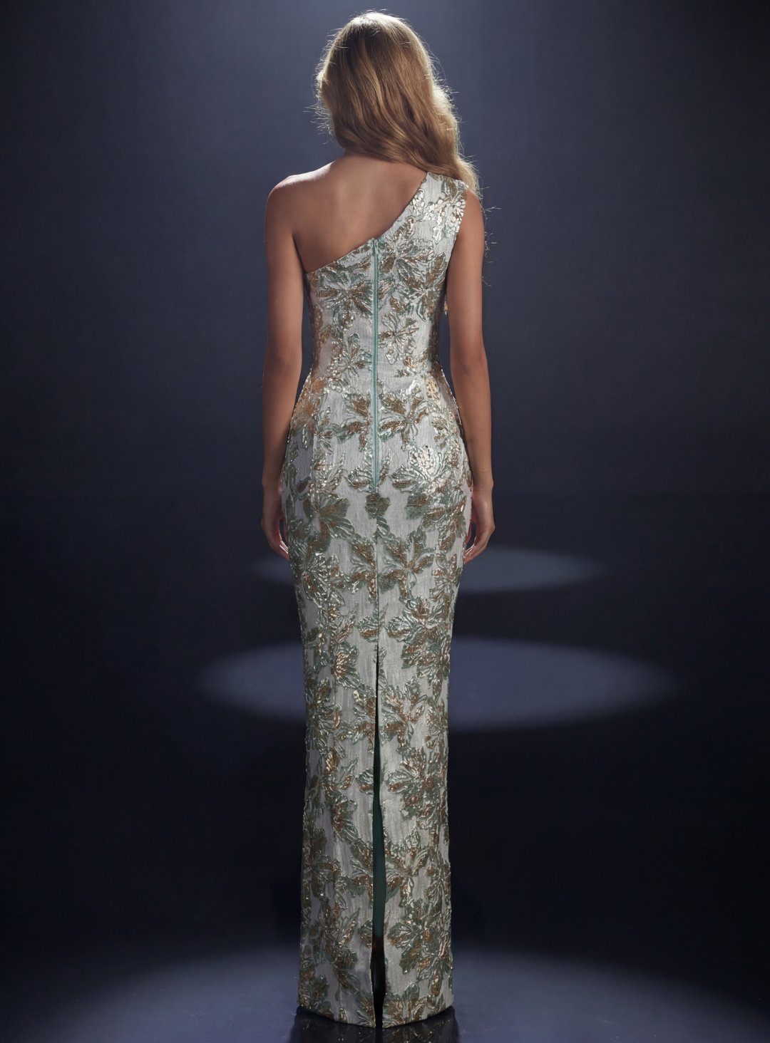 A gorgeous gown by Nicoletta NC4014. A sophisticated one-shoulder gown designed to captivate. Crafted in an intricately embroidered fabric with shimmering sage and gold floral detailing, this fitted silhouette beautifully contours the body for an elegant, sculpted look.