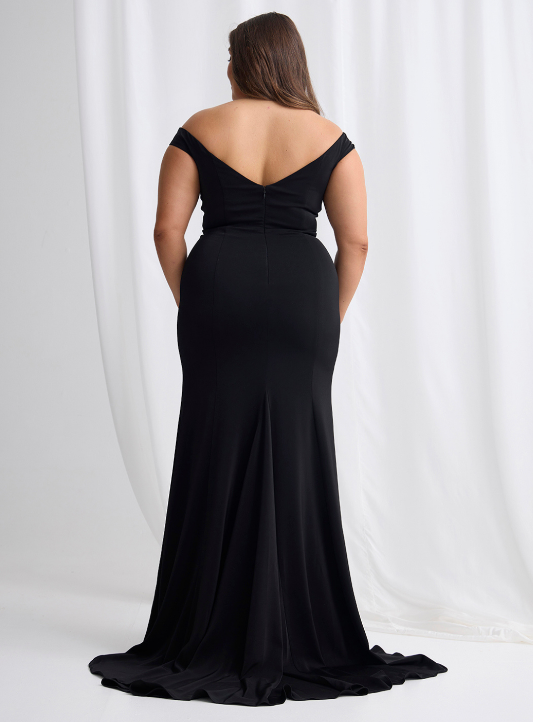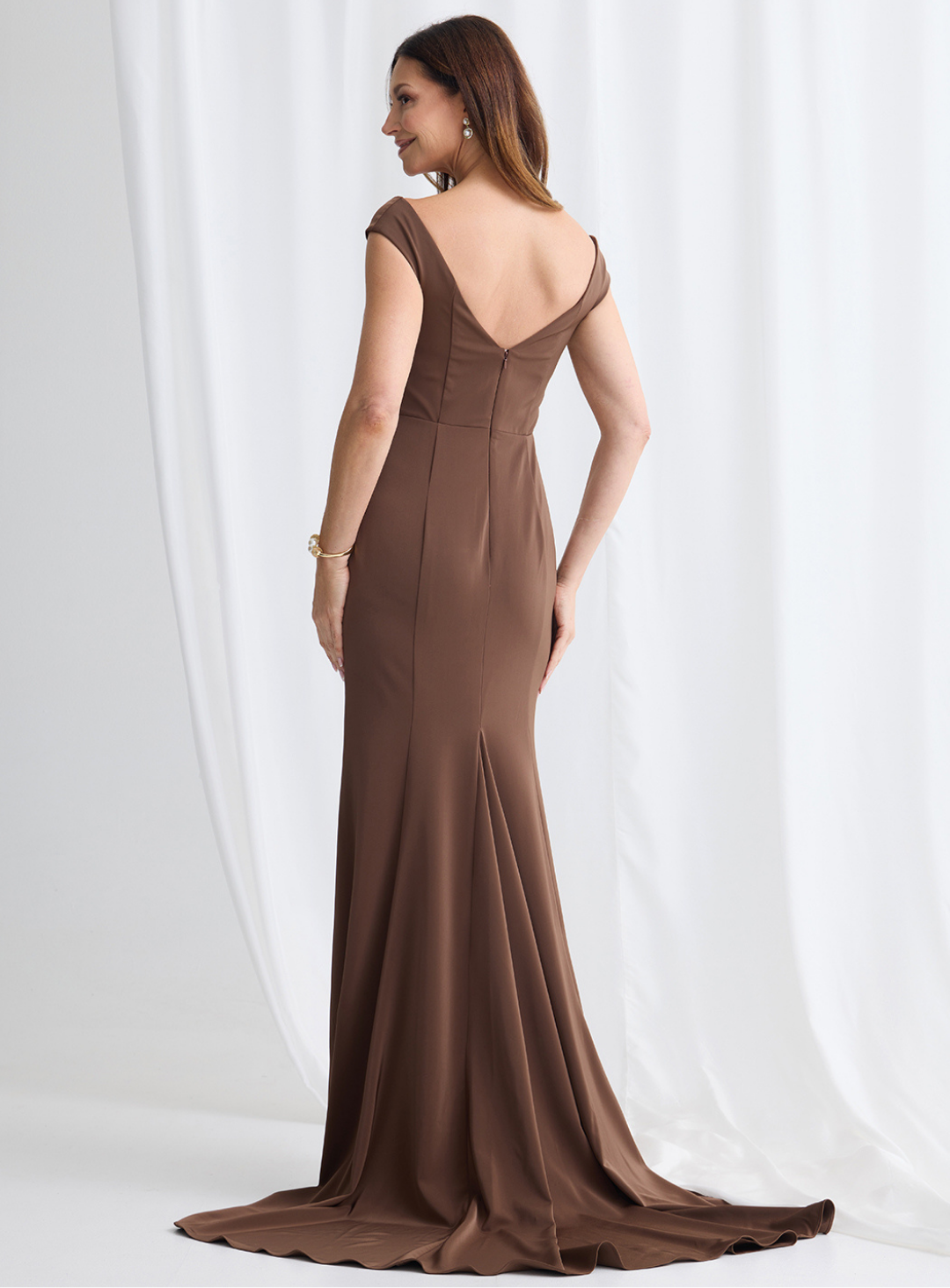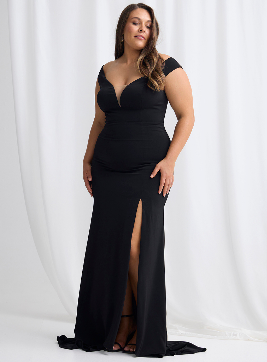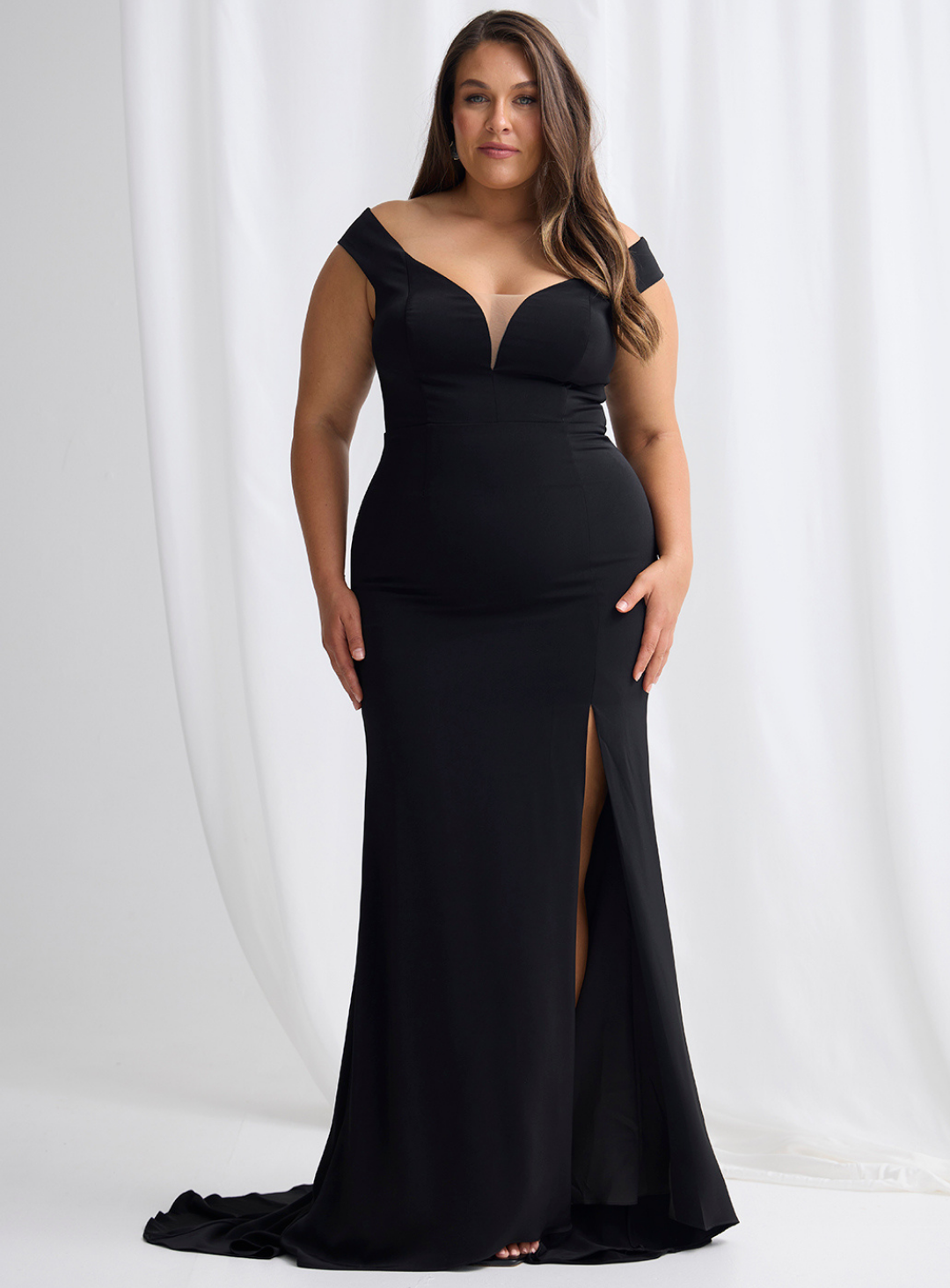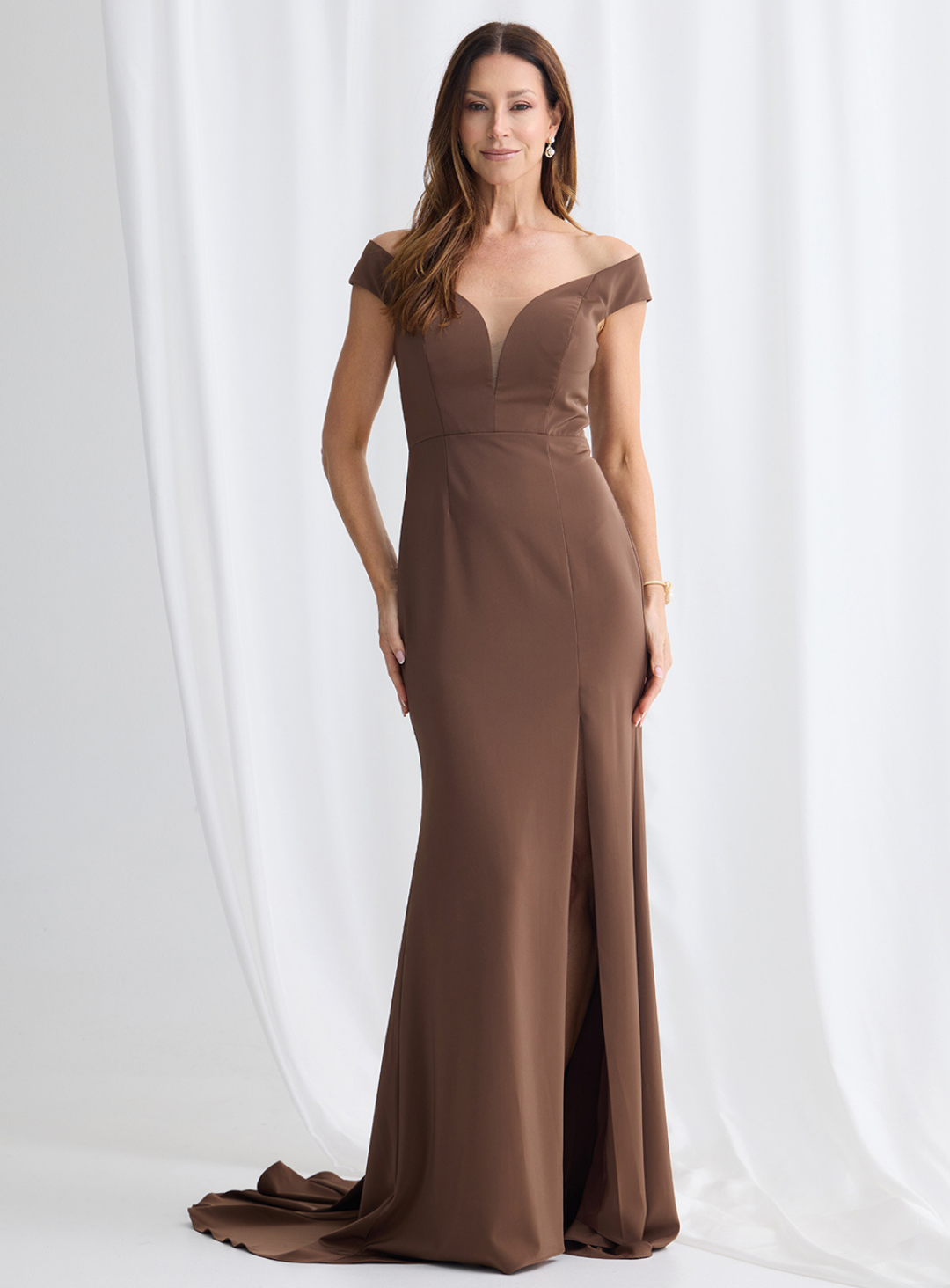 A gorgeous gown by Trellis Lane, perfect for mother of the bride/groom or wedding guest! An elegant off shoulder design featuring a mermaid skirt with mesh detailing on the neckline and a thigh high split. The small train adds elegance and drama!